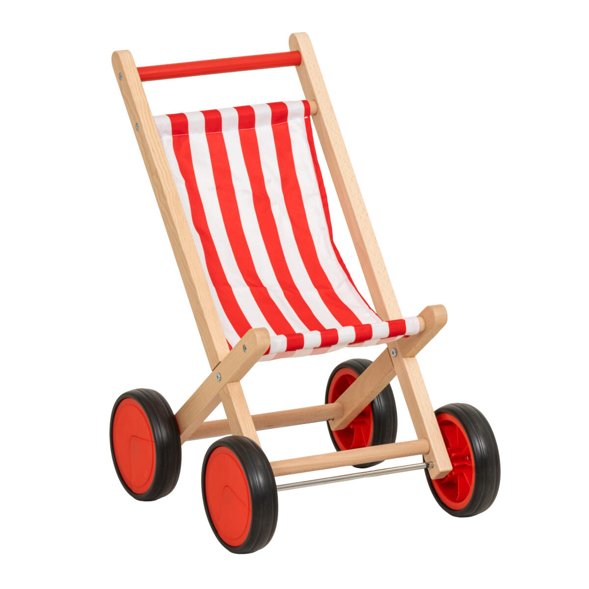 En dockvagn av FSC-märkt trä med fast sufflett. Gummilist runt hjulen ger en tyst framfart. Ett rutigt täcke att bädda med ingår. PVC-fri. Från 18 mån.
