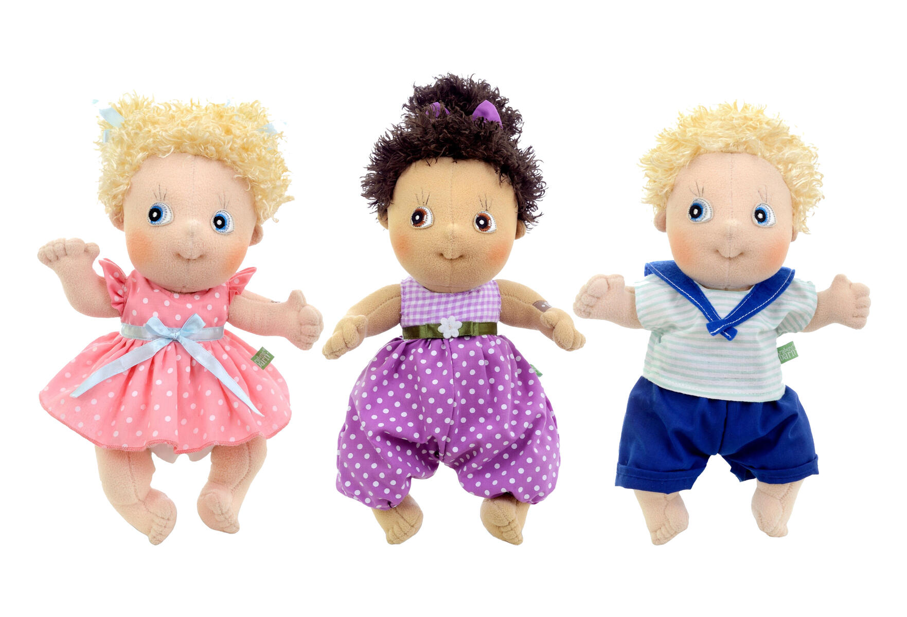 Mycket fina och mjuka dockor med egen personlighet och avtagbara kläder. Blandade färger. Dockor av polyester, stoppning av återvunnen polyester. PVC-fri. Från 0 år.