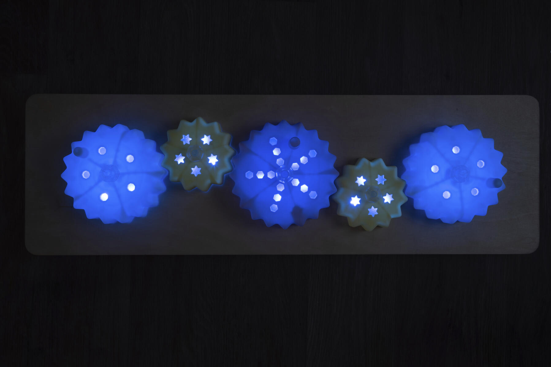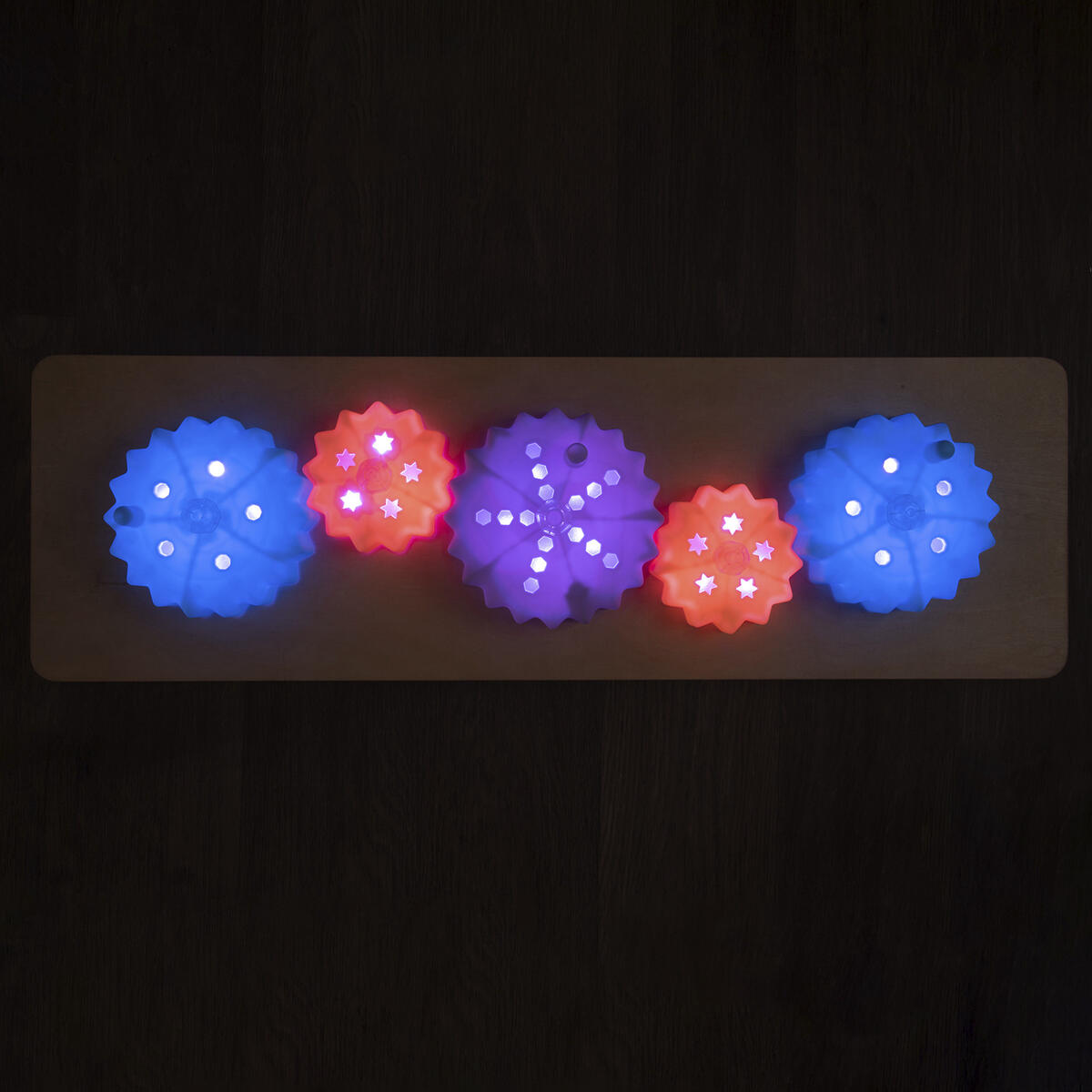 En platta med kugghjul som lyser och byter färg när de roteras. Ett bra sätt att både öva finmotorik och öga-handkoordination. Plattan kan användas på bord och golv eller fästas på vägg. Kräver 3 st AA-batterier (ingår ej). Mått: 25x85 cm. PVC-fri. Från 10 månader.