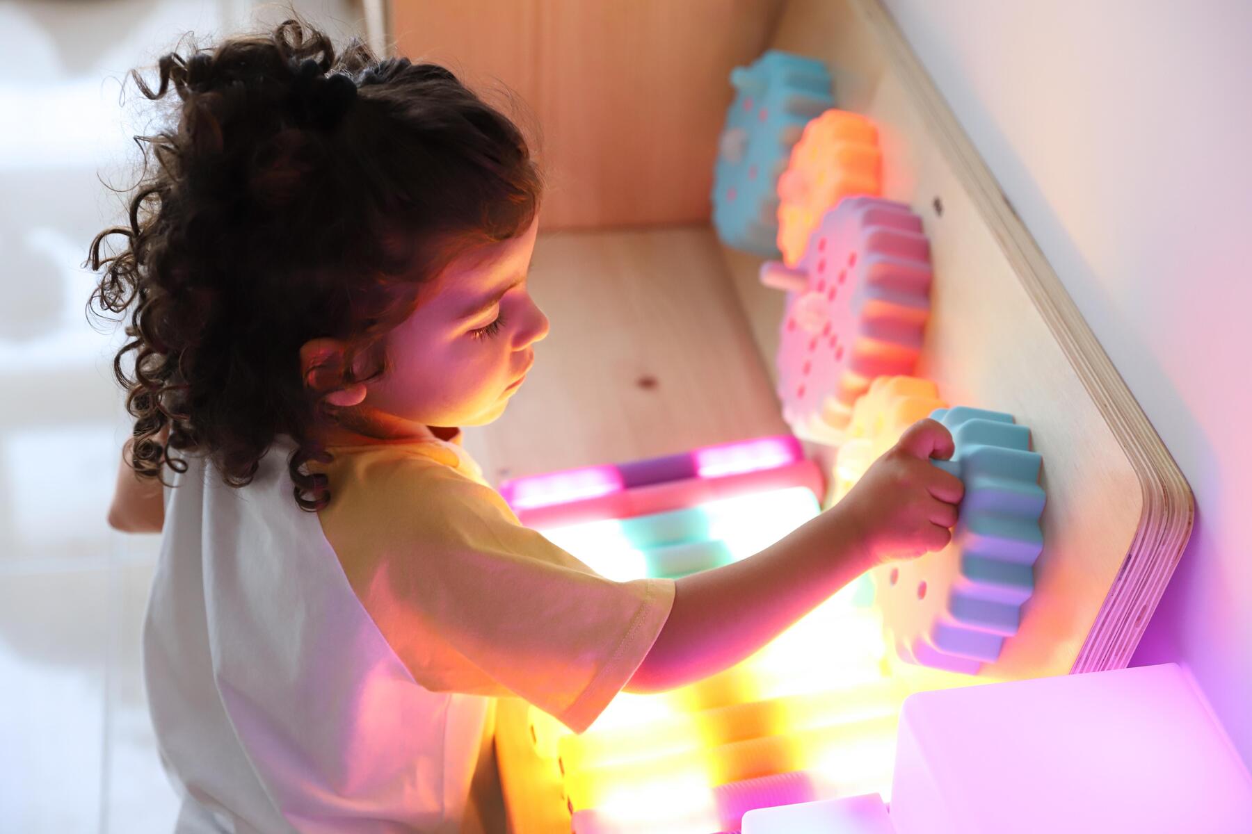 Kombinera kommunikation, stimulansrespons och orsakssamband med finmotorik och upptäckarlust. Varje del tänds med olika tekniker. Du kan trycka, växla, vrida, dra eller skjuta för att få cirkeln att lysa. Kan hängas på vägg eller användas på golv eller bord. Kräver 3 st AAA-batterier (ingår ej). Mått: 25x80x4 cm. Av plywood och ABS. PVC-fri. Från 10 månader.