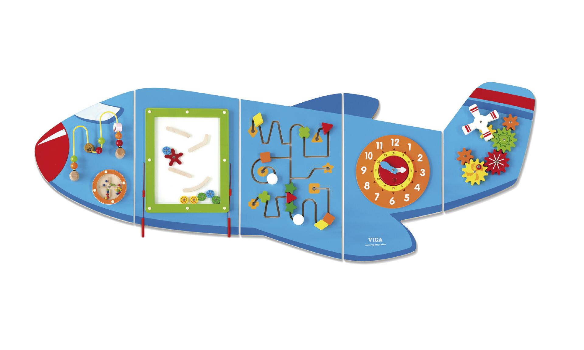 Väggtavla med olika funktioner och spel. Robust struktur som kan användas i flera år. En idealisk leksak för träning av finmotoriken. Mått: 162x81x5 cm. Av FSC-märkt kvalitetsträ. PVC-fri. Från 18 månader.