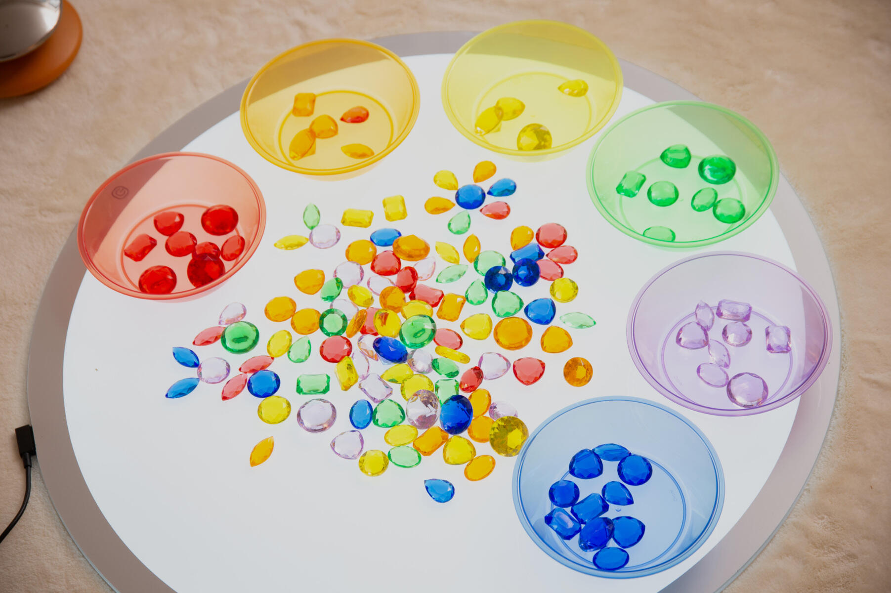 144 st/fp. Färgglada och detaljerade juveler för att räkna, sortera, skapa mönster och använda i enkla matteaktiviteter. De genomskinliga färgerna gör dem idealiska för användning på en ljuspanel. Innehåller 8 varianter i 6 färger (röd, orange, gul, grön, blå och lila) i en praktisk förvaringsburk med lock. Av akryl. PVC-fri. Från 3 år.