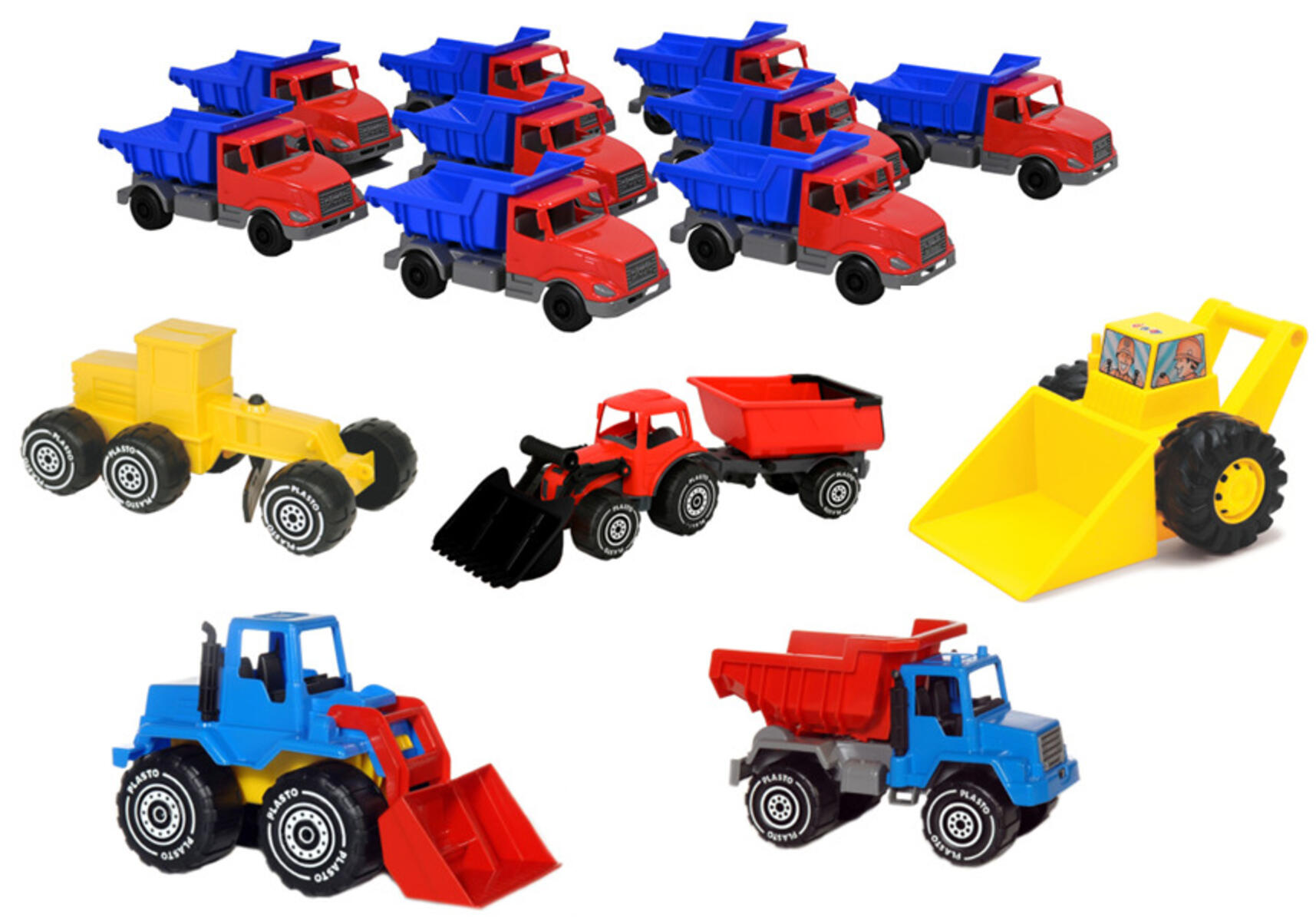 Fordonen kan användas för att leka ensam eller tillsammans med andra barn. Alla arbetsfordon är av starka och klara färger. Med hjälp av de rörliga delarna såsom tippbart lastflak och grävskopor på fordonen blir leken mer verklig. Mått: ca 15–55 cm. Av PE. PVC-fri. Från 2 år.