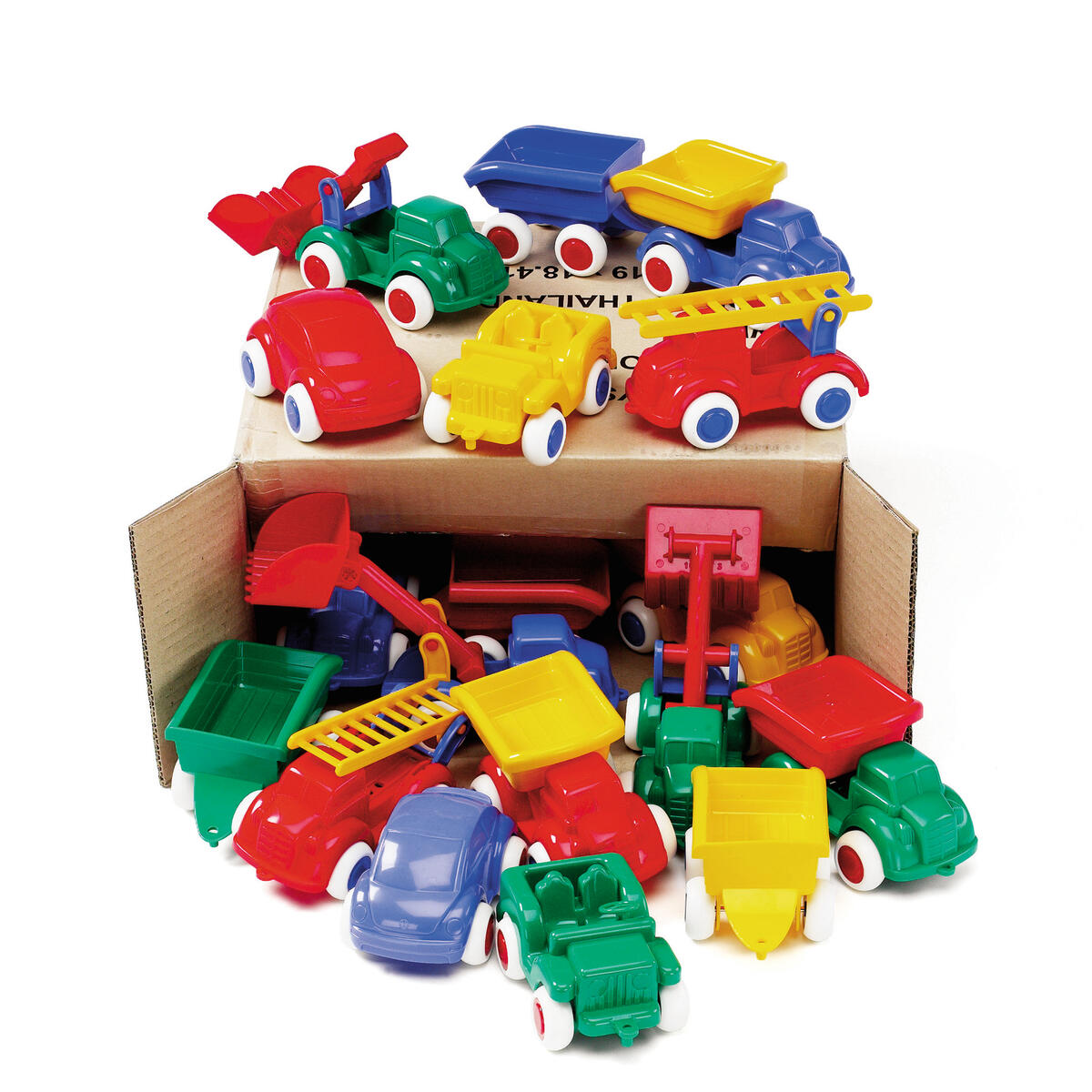 30 st/fp. Innehåller blandade fordon med däck som gör att de rullar tystare. Mått bil 9x4 cm, båt 10x5 cm. Av återvunnen PP. Tål maskindisk. Från 1 år. PVC-fri.