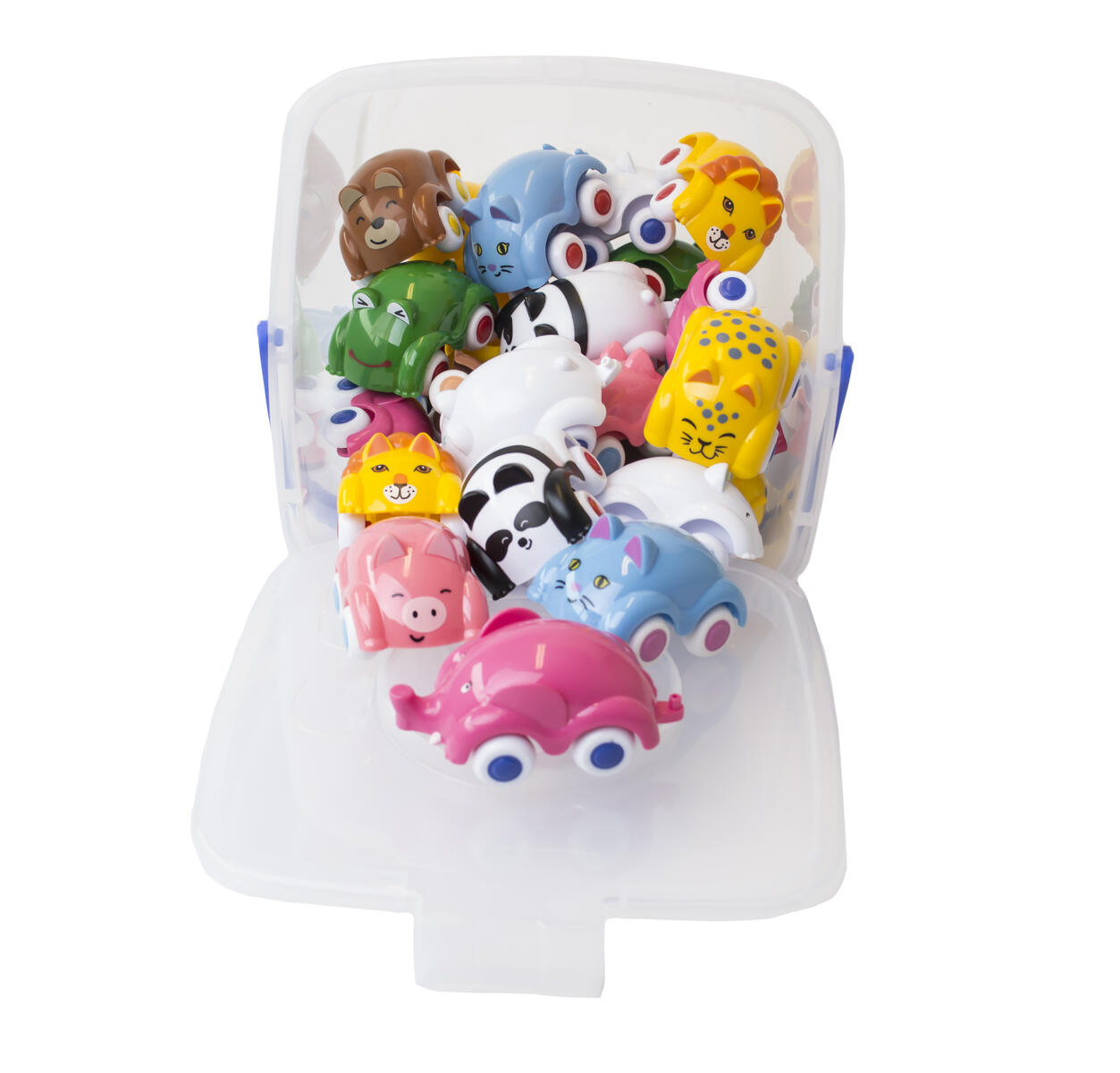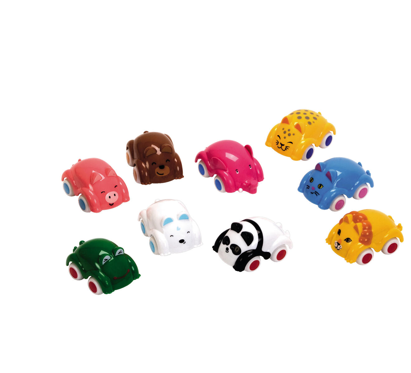 Knubbiga småbilar med djuransikte. Med gummihjul för tystare lek. Blandade modeller. Av livsmedelsgodkänd PE, hjul av LDPE. Levereras i praktisk förvaringshink med lock. Tål maskindisk. PVC-fri. Från 1 år.