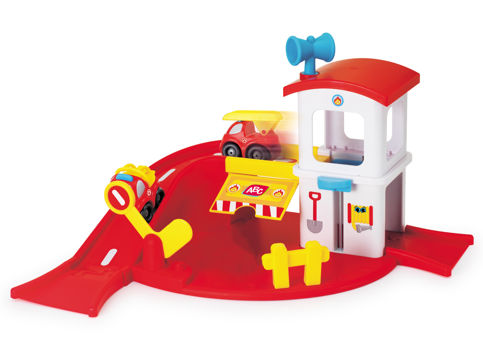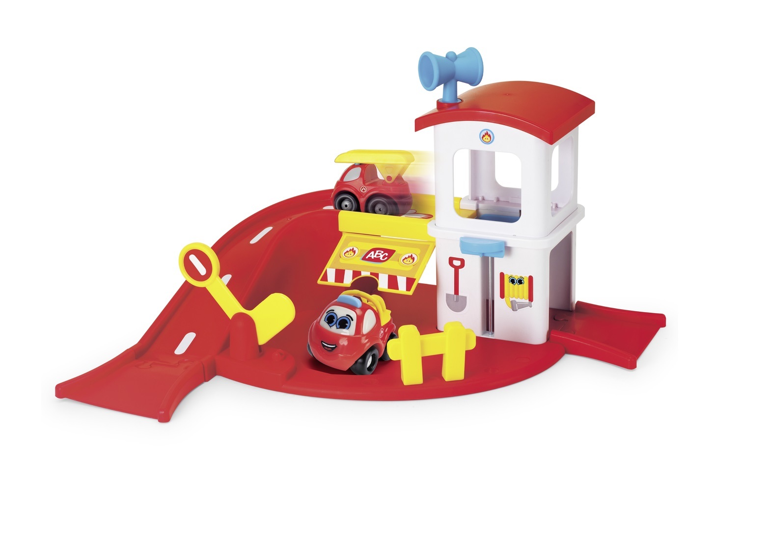 Brandstation för de minsta barnen med två våningar, hiss och två fordon. Mått: brandstation 42x33x26 cm, bilar 7 cm långa. PVC-fri. Av ABS. Från 12 månader.
