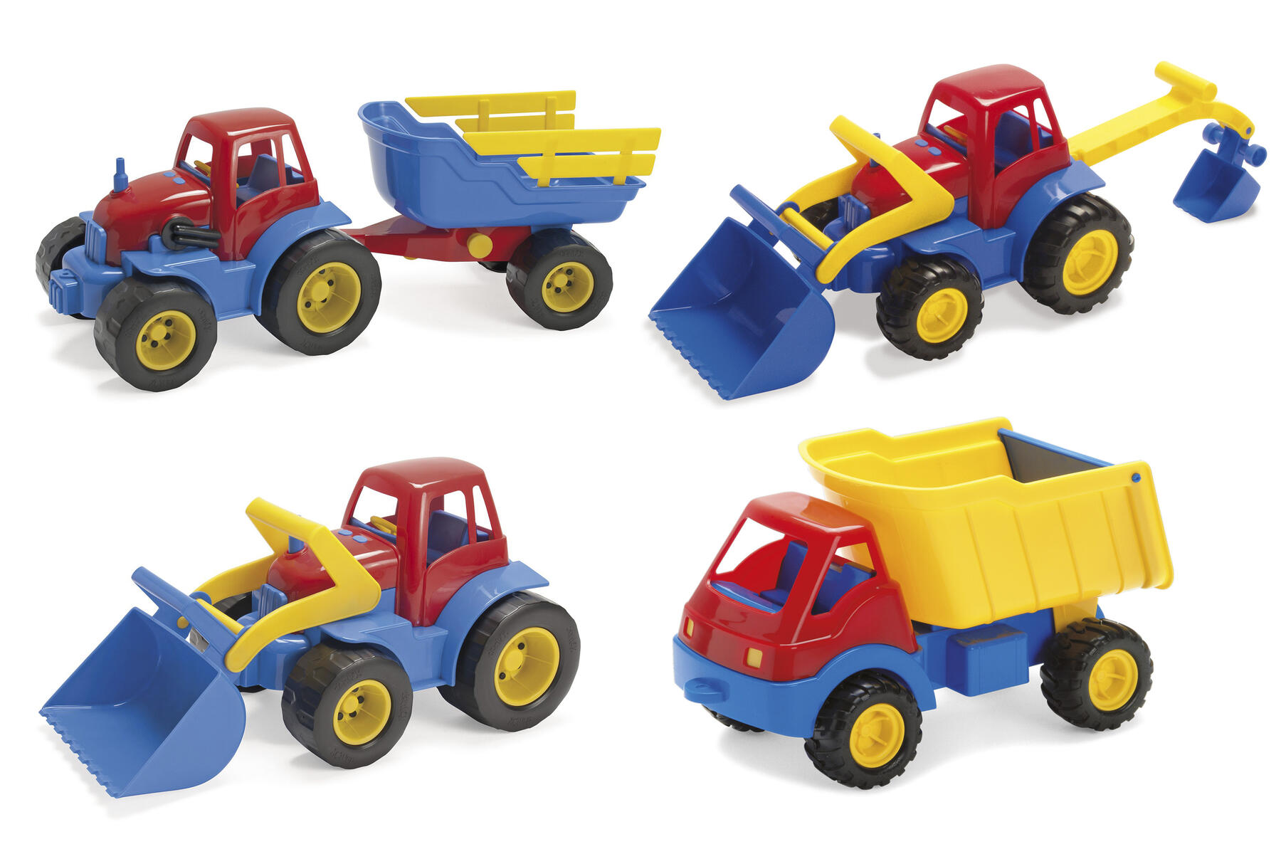 Traktorer med utrustning enligt bild. Avtagbara släp. Längd på traktor med släp 60 cm. Längd på traktor med skopa 48 cm. Av livsmedelsgodkänd PE. PVC-fri. Från 2 år.