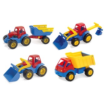 Fordonen kan användas för att leka ensam eller tillsammans med andra barn. Alla arbetsfordon är av starka och klara färger. Med hjälp av de rörliga delarna såsom tippbart lastflak och grävskopor på fordonen blir leken mer verklig. Mått: ca 15–55 cm. Av PE. PVC-fri. Från 2 år.
