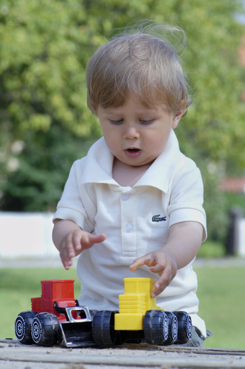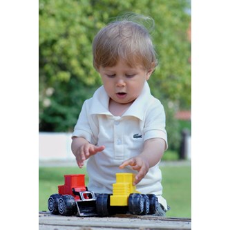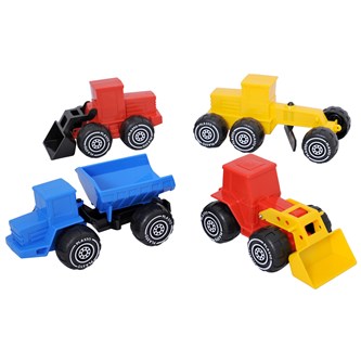 Fordonen kan användas för att leka ensam eller tillsammans med andra barn. Alla arbetsfordon är av starka och klara färger. Med hjälp av de rörliga delarna såsom tippbart lastflak och grävskopor på fordonen blir leken mer verklig. Mått: ca 15–55 cm. Av PE. PVC-fri. Från 2 år.