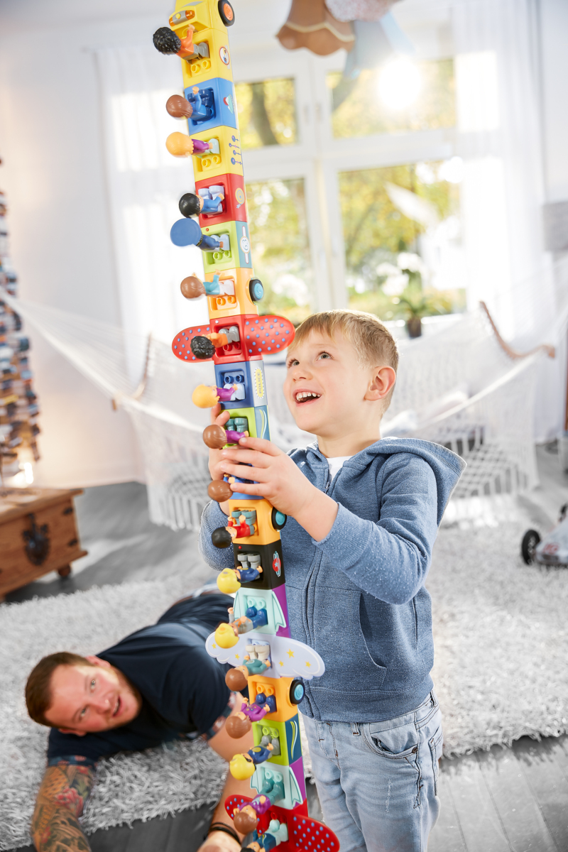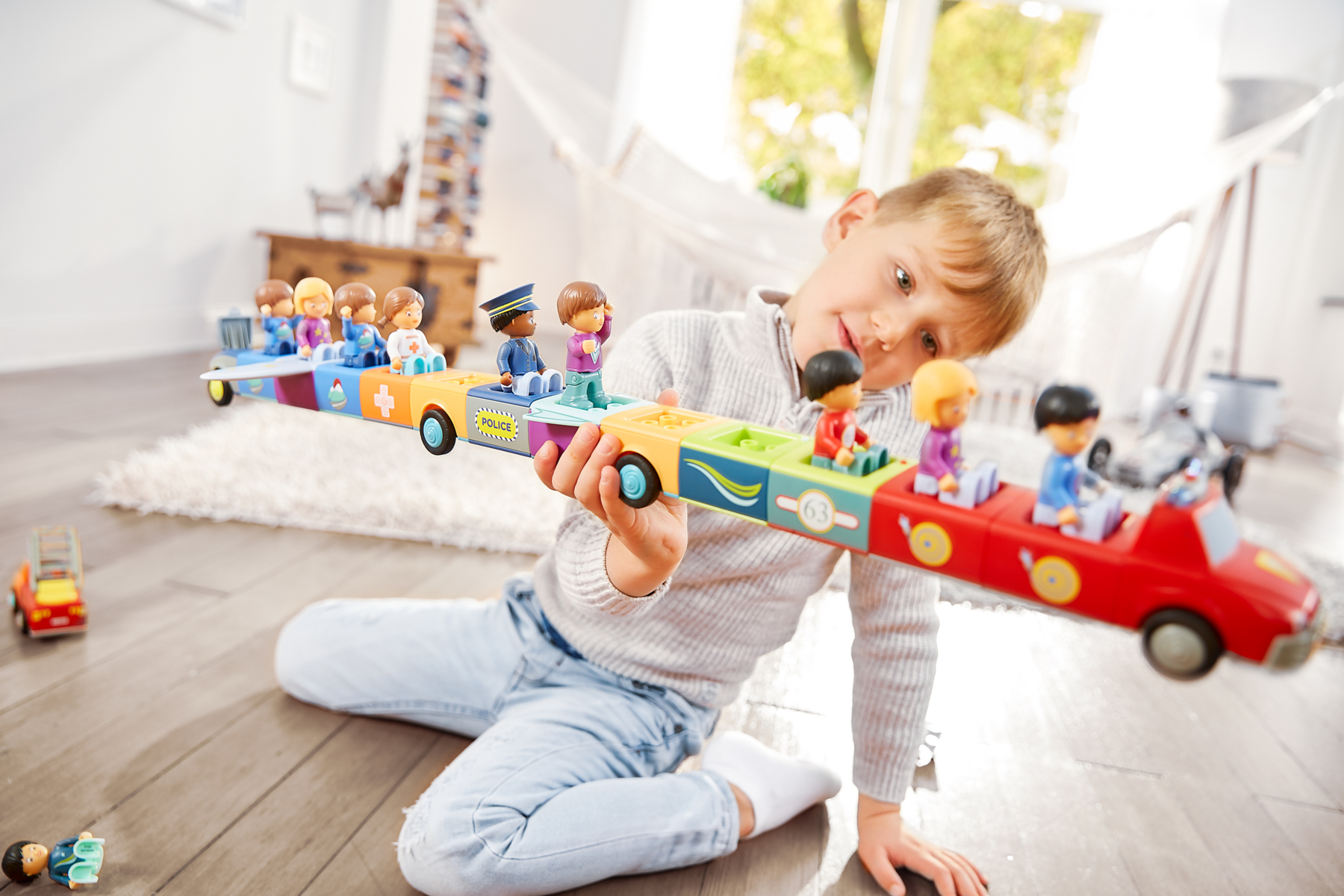 3 st/fp. Paket med traktor, bärgare och grävare. Varje leksaksbil består av 3 delar med ljus och ljud. De är hopsättbara med andra Toddys bilar och en rörlig docka ingår. Av ABS, PP och TPE. Längd på bil: 28 cm. Från 18 månader.