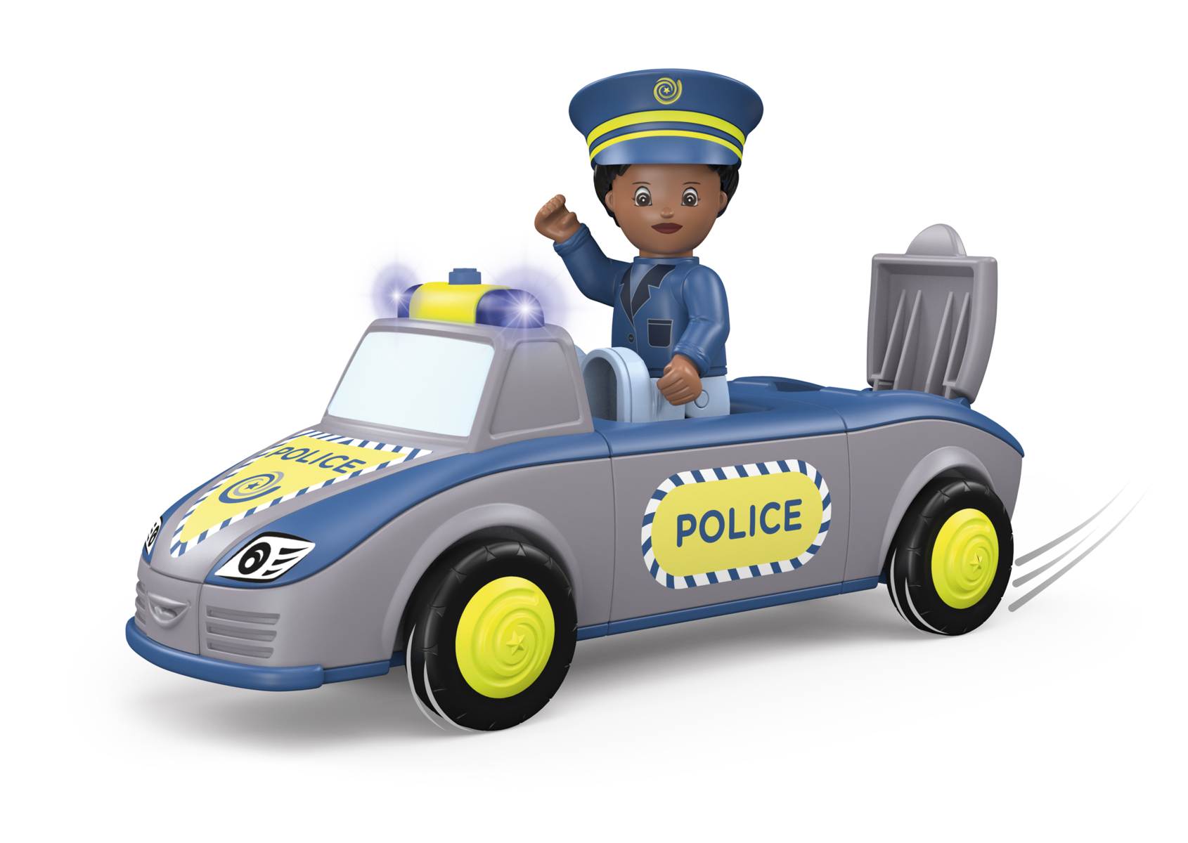 Toms polisbil är en leksaksbil i 3 delar med ljus och ljud. Den är hopsättbar med andra Toddys bilar och en rörlig docka ingår. Kräver 3 st LR44 knappcellsbatteri (ingår ej). Längd på bil: 28 cm. Av ABS, PP och TPE. Från 1 år.