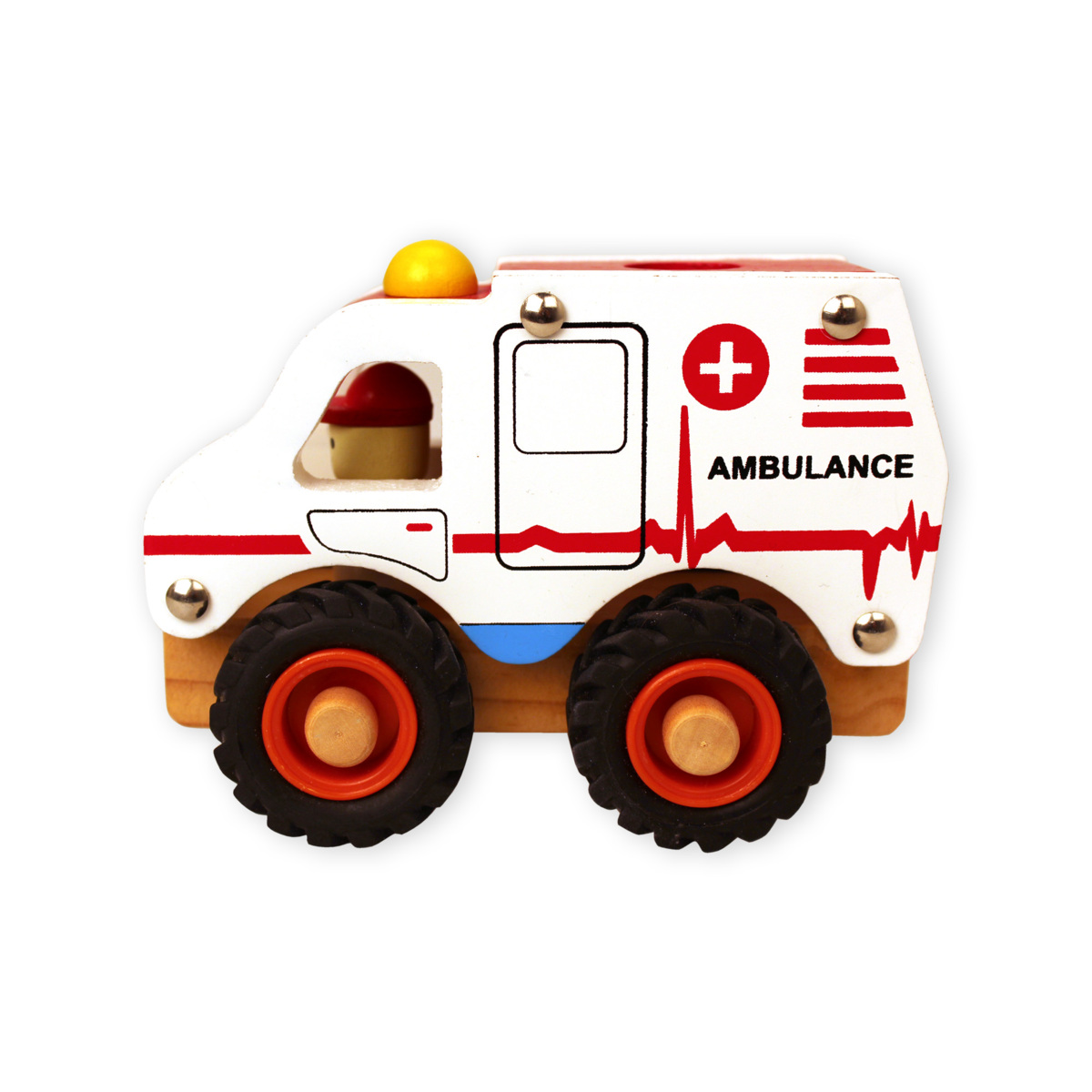 Ambulans med en lekfigur. Bilen har gummihjul som bidrar till en tystare lek. Mått: 13x10x7 cm. Av FSC-märkt trä och gummi. PVC-fri. Från 18 månader.