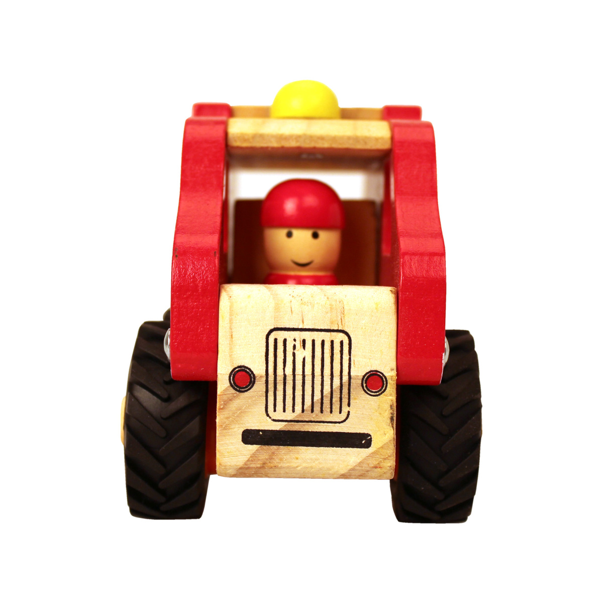 Traktor med en lekfigur. Bilen har gummihjul som bidrar till en tystare lek. Mått: 13x10x7 cm. Av FSC-märkt trä och gummi. PVC-fri. Från 18 månader.
