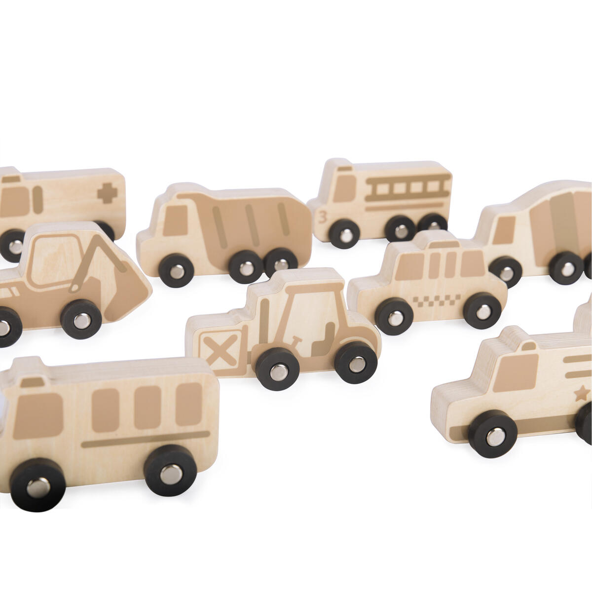 10 delar. Detta set med träbilar är gjort för att hålla länge. De stora delarna gör dem utmärkta för en liten hand att hantera. Av trä. PVC-fri. Från 2 år.