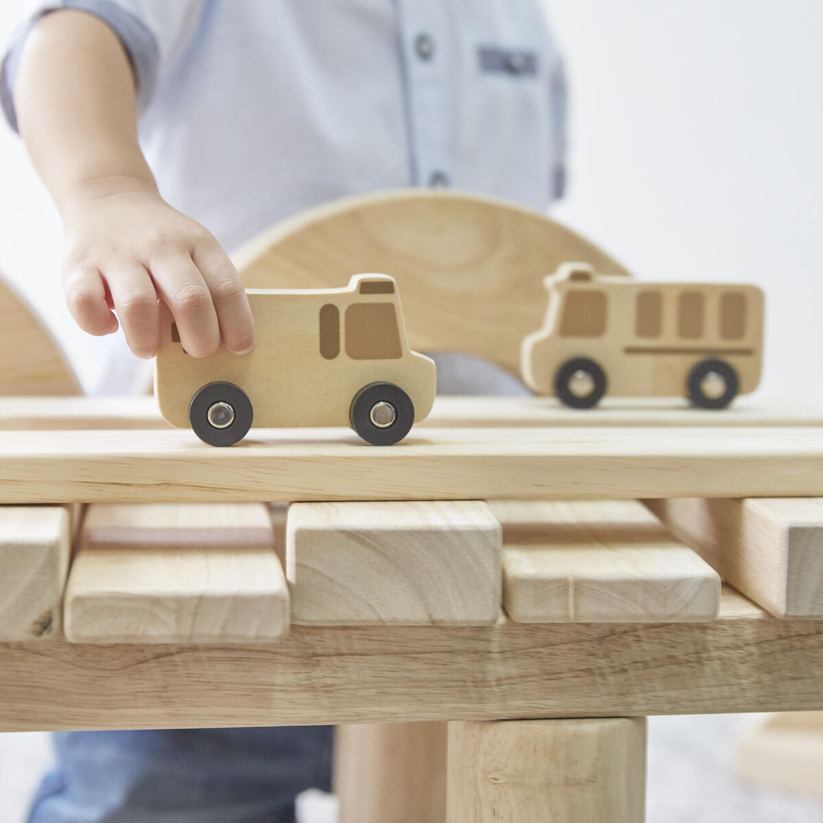 12 st/fp. Färgglada fordon i massivt bokträ, vart och ett med fyra jul samt metallaxlar. Laseringen gör bilarna taktila och ger en sensorisk upplevelse. Blandade modeller, där färgvariationer kan förekomma. Storlek på buss: 11x5x4 cm. Av FSC-märkt trä. PVC-fri. Från 1 år.