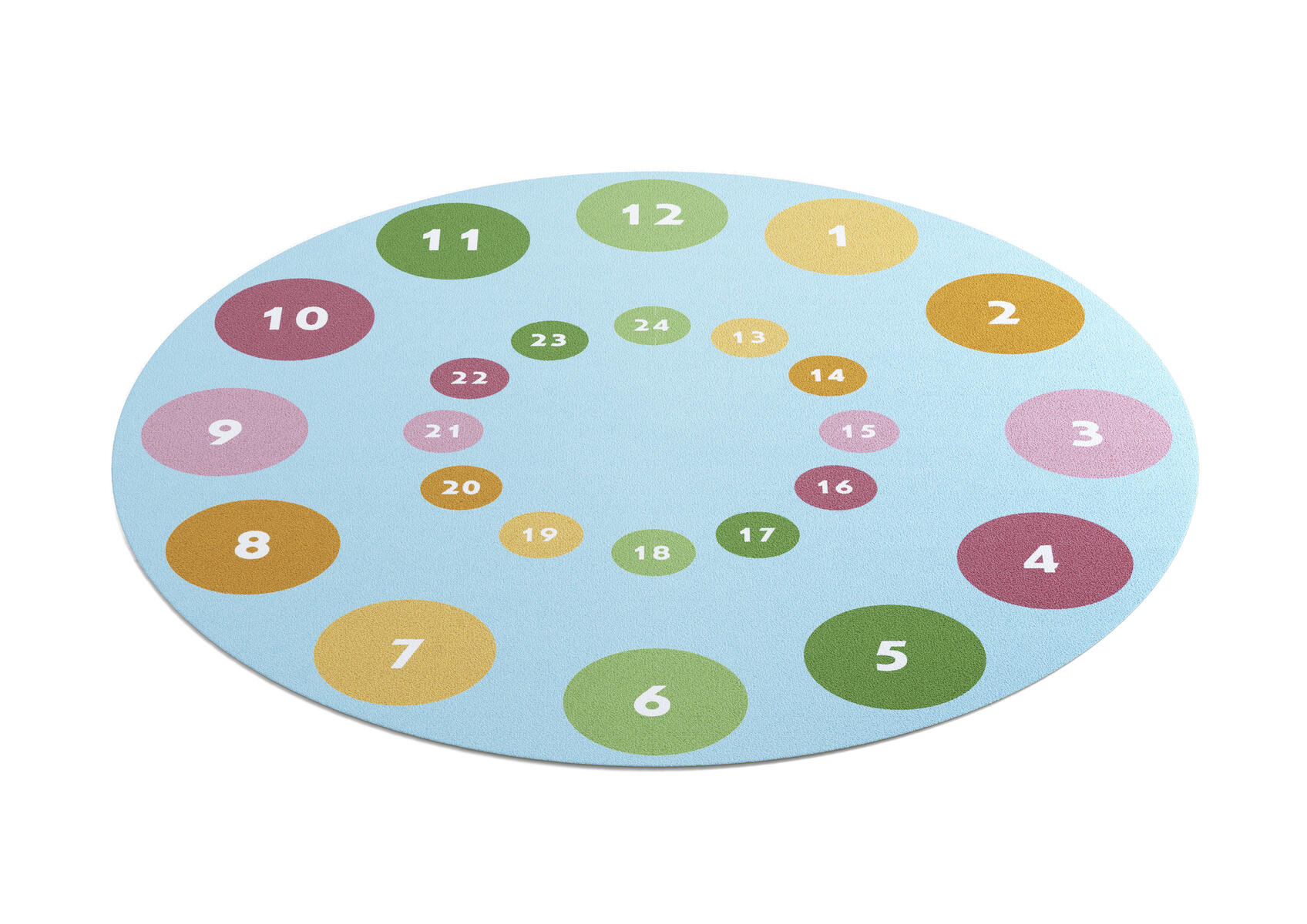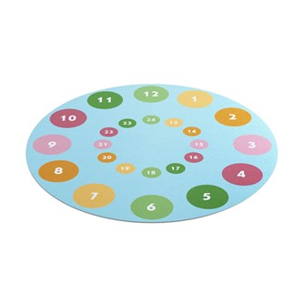 Matta med tryckt klocka. Baksida med halkfri gummibeläggning. Mattan fungerar på värmegolv. Mått: ø 200 cm. Lugghöjd 3 mm. 100 % öglad polyamid. Får inte läggas på fuktiga golv.