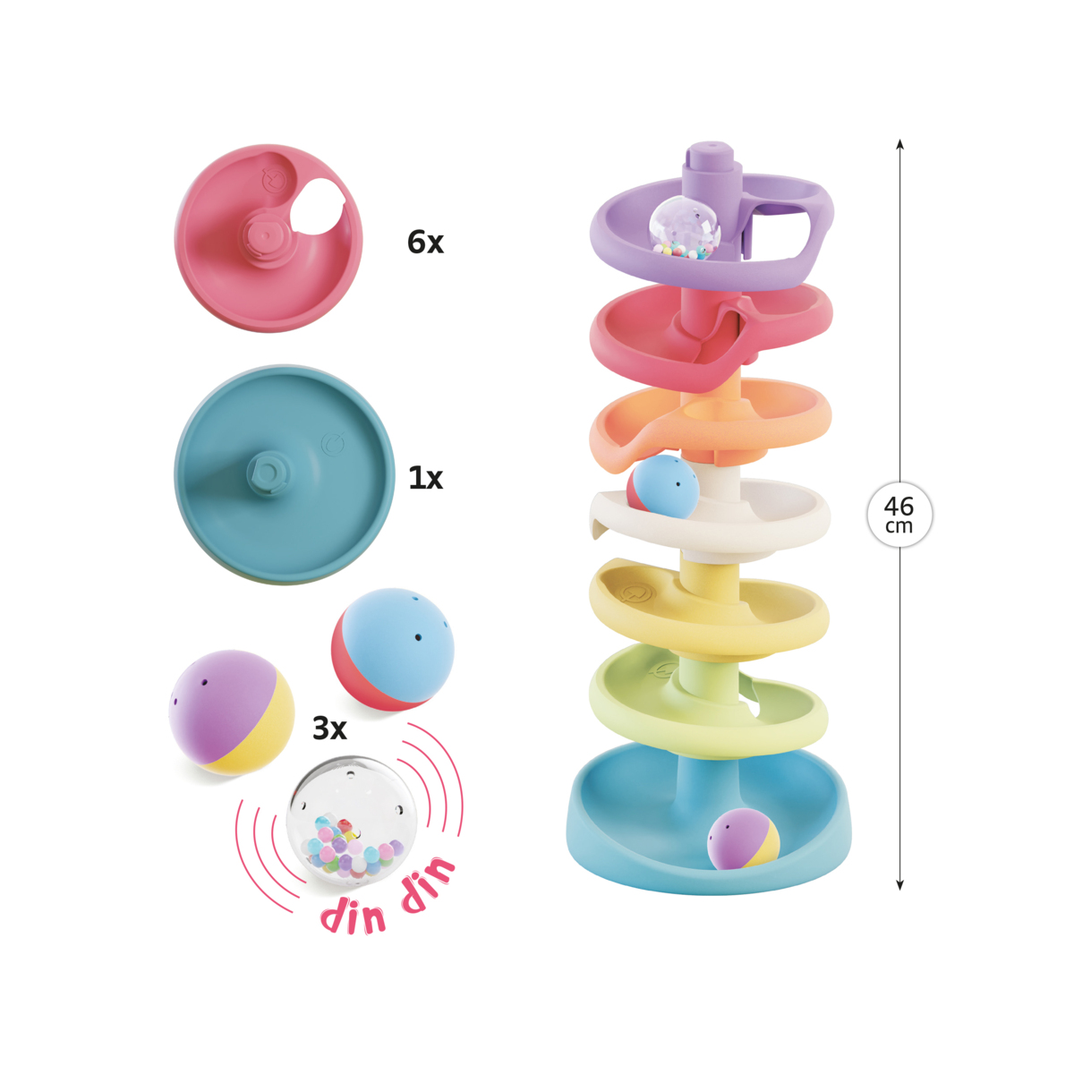Stort sluttande torn i trä med 8 kulor. Lägg kulorna högst upp, låt dem rulla ner till botten och följ dem på väg ner. Med rejäla fötter för låg tipprisk. När tornet inte används kan kulorna lagras i baskanalen. Av trä. PVC-fri. Från 10 månader och uppåt.