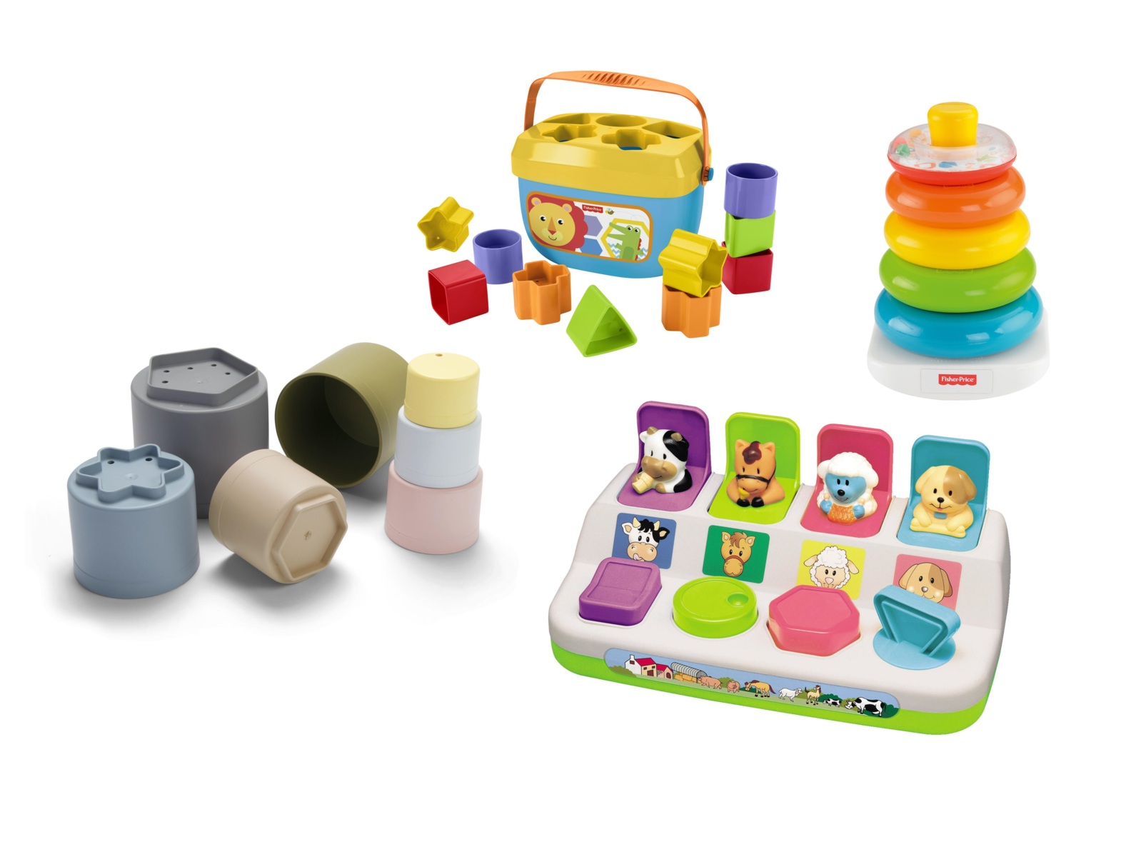 10 pedagogiska byggbägare numrerade 1–10 på ovansidan, där siffran 10 motsvarar den största hinken. Stapla och bygg, eller lek med sand och vatten. Bägarna har två små hål på ovansidan så att vatten eller sand kan strila igenom. Den smarta förvaringshinken har ett lock med 4 hål i form av geometriska former och 4 former för sortering medföljer. Totalhöjd 95 cm. Av polypropen och polyeten. PVC-fri. Från 1 år.