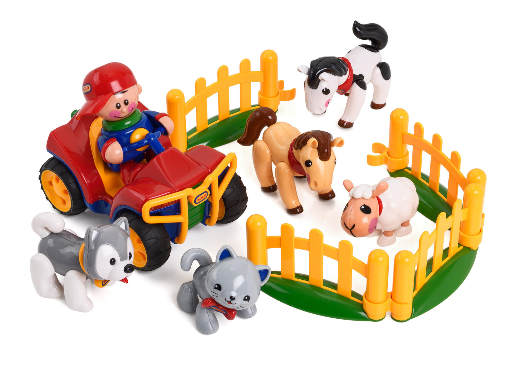 Kör fyrhjuling eller bygg en hage till djuren. Innehåller en huskyhund, en katt, två hästar och ett får. Djuren har en mängd olika rörliga och klickande huvuden, svansar och ben. Fyrhjulingen levereras med en pull back-motor men kan också frihjulas. Uppmuntrar till rörelse och samarbete. Tillverkad av ABS. Från 12 månader