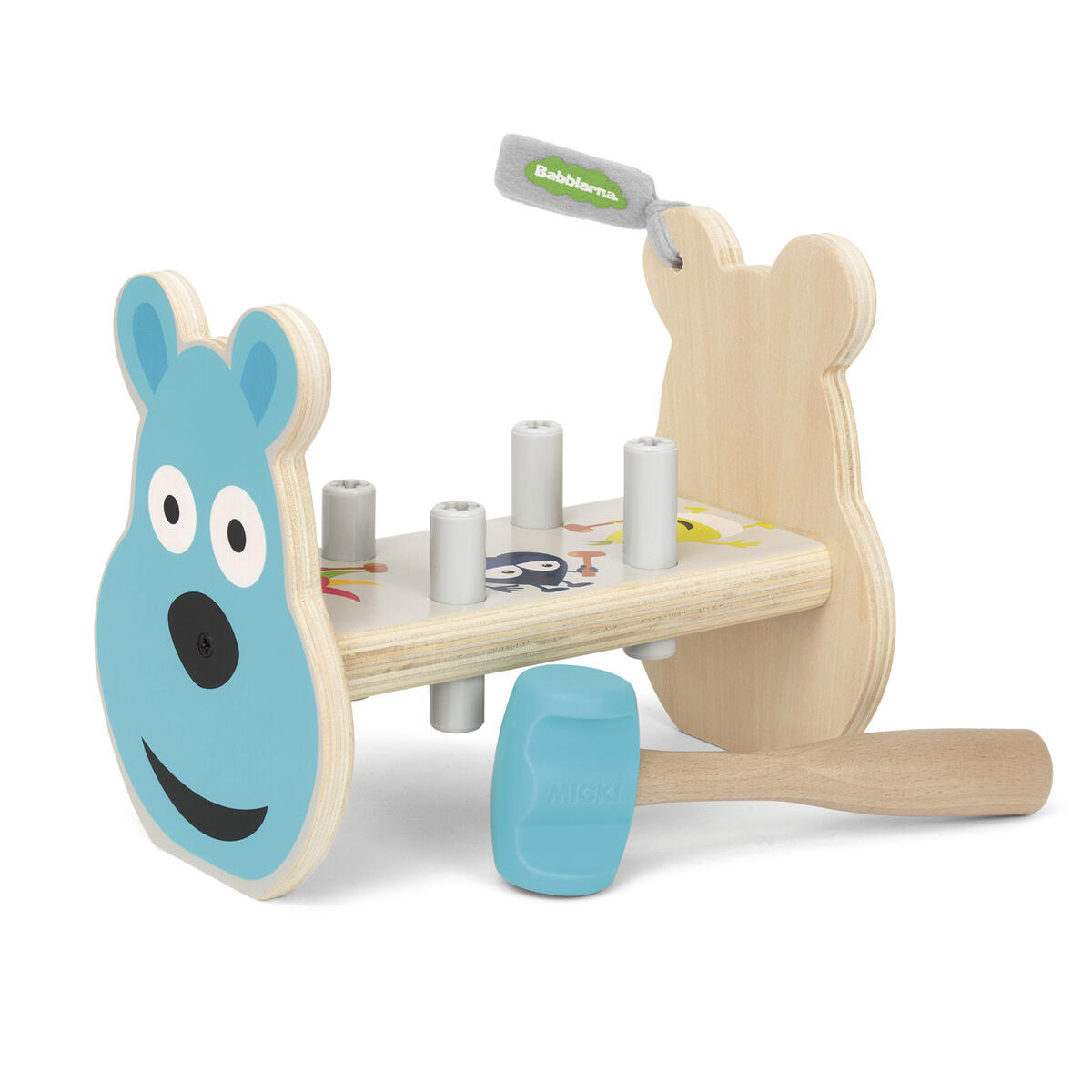Babblarna bultbräda tränar barnets koordination och motorik. När barn babblar, pratar, sjunger och leker tillsammans med Babblarna, utvecklar de också sitt eget tal och språk. Bultbrädan har formen av Babblarnas hund Vovvo. Hammarens huvud är i mjuk plast för att dämpa ljudet och undvika märken. Av FSC-märkt trä och PVC, utan förbjudna ftalater. Mått: 17,5x11x15 cm. Från 1 år.