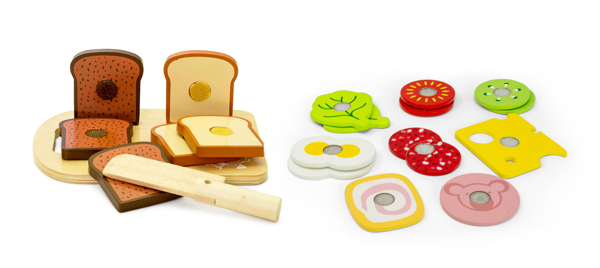 20 delar/fp. Gör en mumsig smörgås med hjälp av detta set med delbart bröd, pålägg, skärbräda och brödkniv. Innehåller 6 brödskivor och 12 smörgåspålägg med kardborre mellan delarna. Setet innehåller korv, ägg, ost och andra favoriter. Alla delar är av FSC-märkt trä. Skärbrädans mått är 19x13 cm. PVC-fri. Från 2 år.
