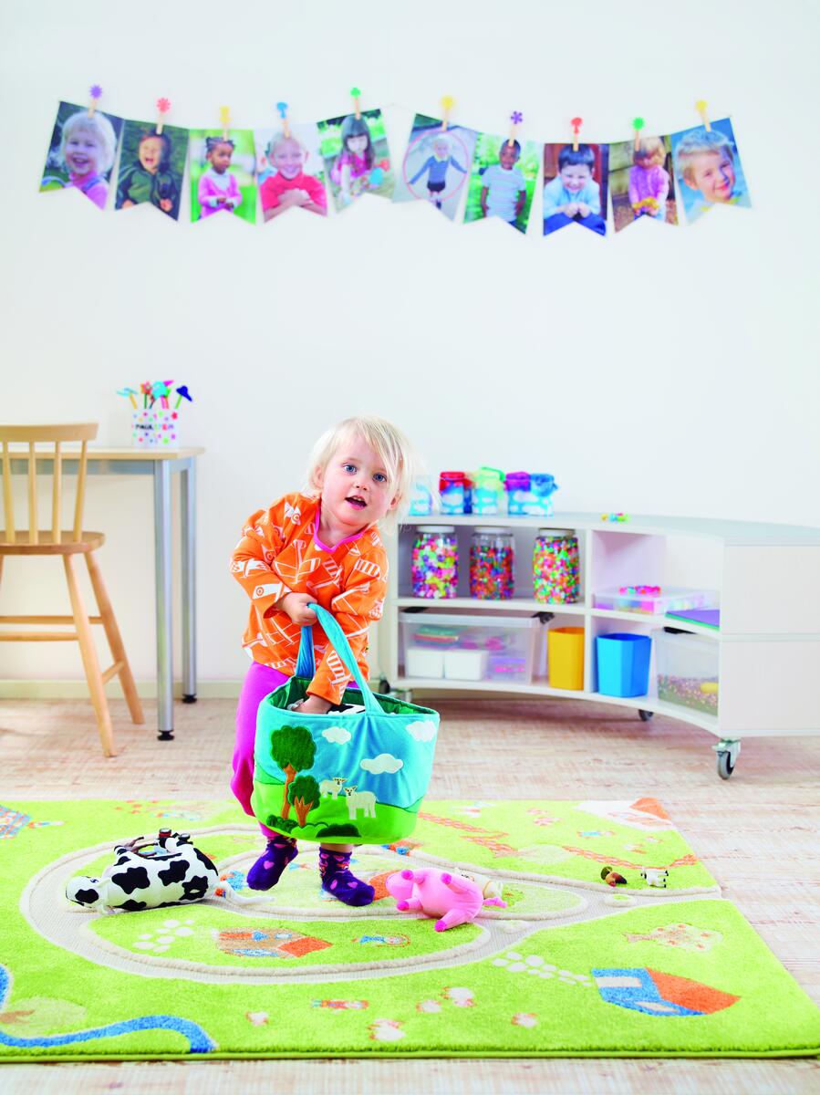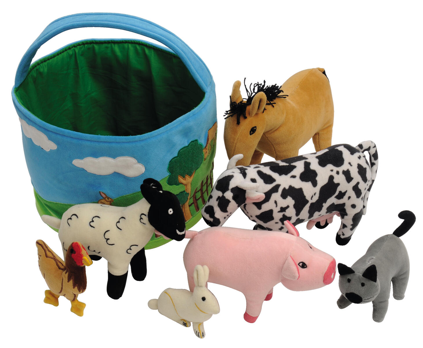 En fin korg med sju mjuka kompisar från bondgården. Detaljrika djur som uppmuntrar språkutvecklingen: Hur låter djuren? Var kommer mjölken ifrån? Innehåller häst, ko, får, gris, katt, kanin och höna. Korgen är 20 cm hög och ø 25 cm. Ko 25x16x9 cm och katt 14x7x6 cm. PVC-fri. Yttvätt. Från 0 år.