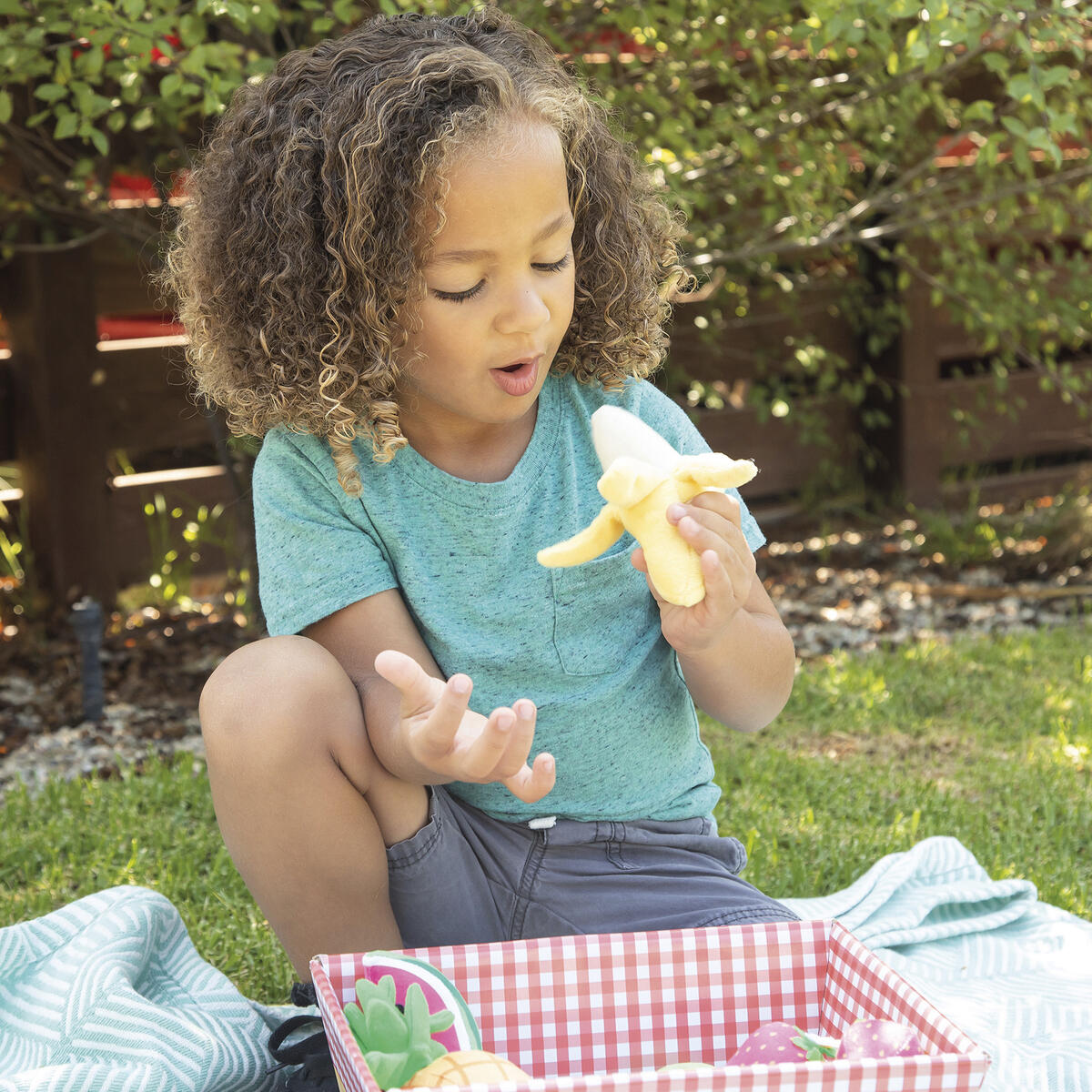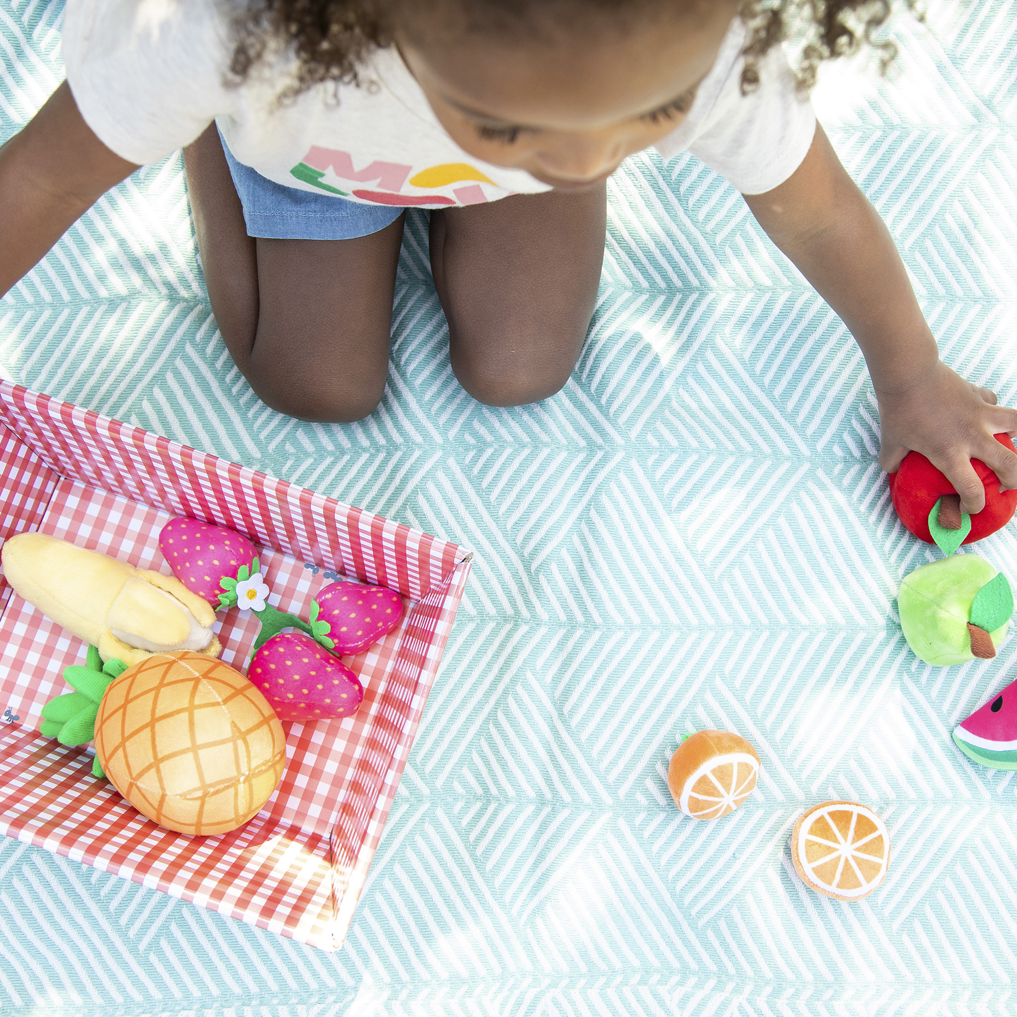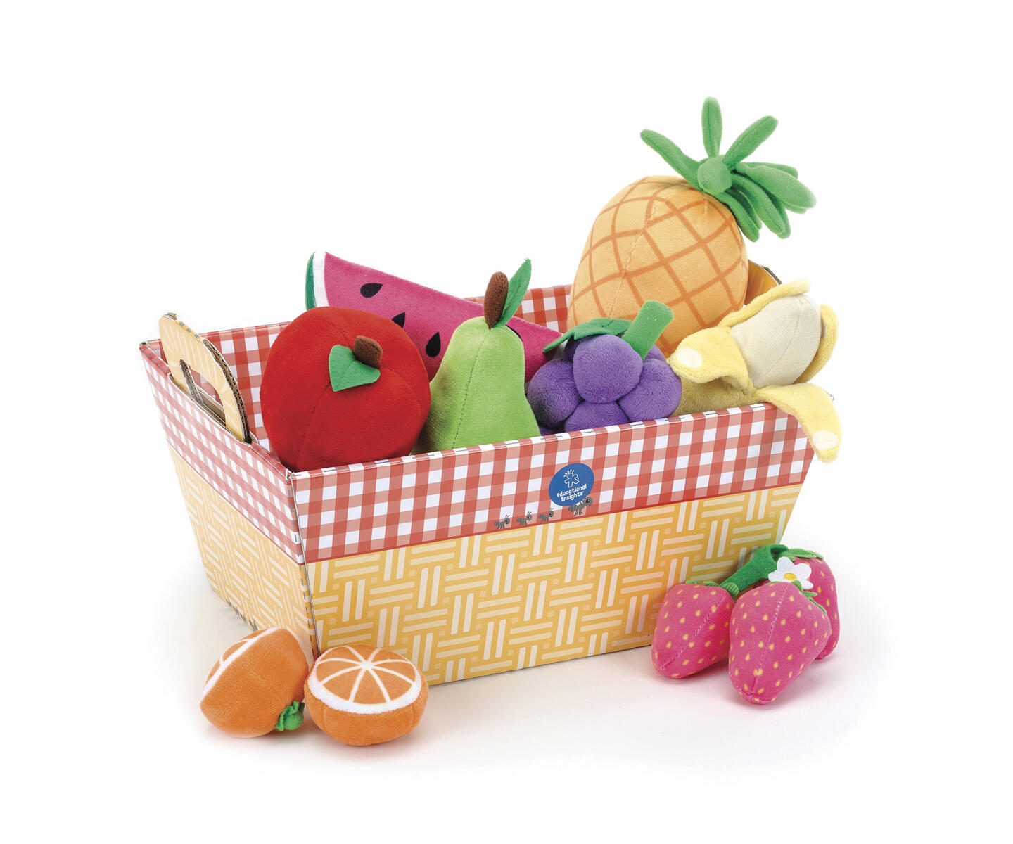 11 delar. Mjukt lekset för små barn att använda i lekköket. Uppmuntrar kreativitet, fantasi och social interaktion. Innehåller 3 jordgubbar, 2 apelsinhalvor, 1 ananas, 1 vattenmelon, 1 päron, 1 äpple, 1 banan och 1 klase vindruvor. Kartonglåda att förvara frukterna i medföljer. Av polyester. PVC-fri. Från 2 år.