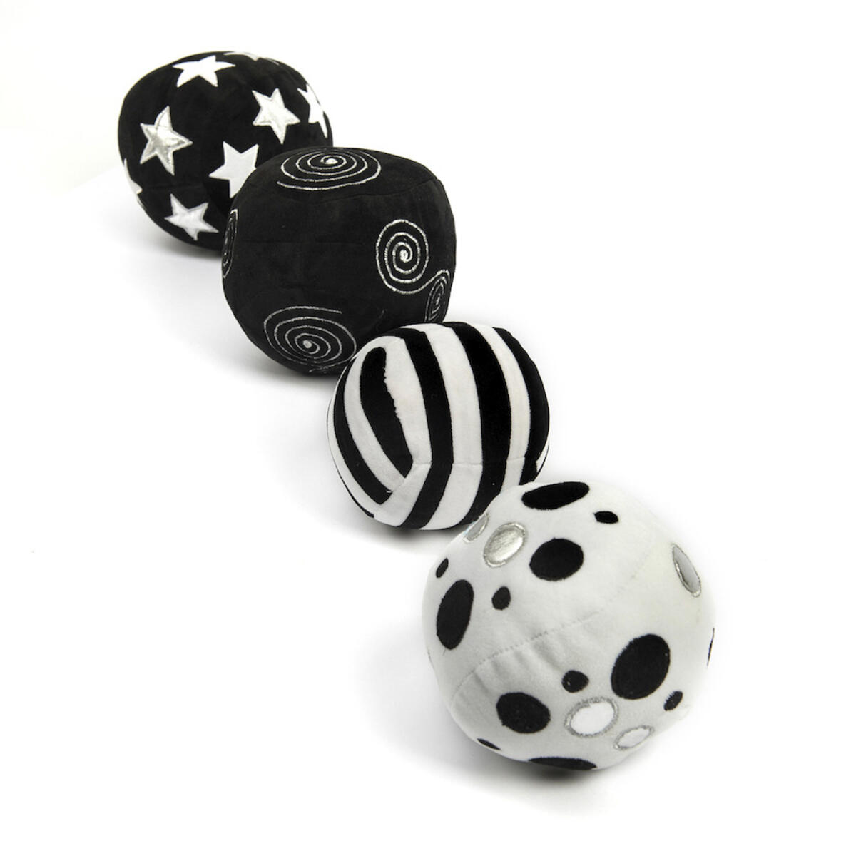 4 st/fp. Mjuka, svart- och vitmönstrade aktivitetsbollar. Ta reda på vilken boll som gnisslar och vilken som klingar. De djärva, kontrasterande mönstren är utformade för att stimulera och engagera. ø 18 cm. PVC-fri. Av polyester. Yttvättas. Från 0 år.