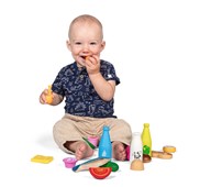 Ett mycket fint set som innehåller skärbräda, kniv och 5 delbara frukter. Kardborre mellan delarna. Tillverkat av FSC-märkt trä och färgat med ekologisk, vattenbaserad och giftfri färg. PVC-fri. Från 18 mån.