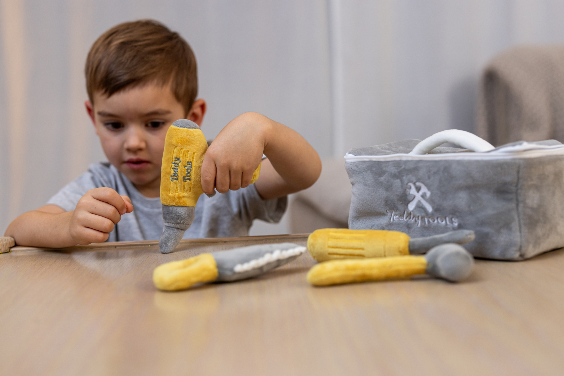 6 delar. En mjuk verktygslåda i plysch med en såg, en hammare, en skruvmejsel och en borrmaskin. Storlek på väska: 21x12x11 cm. Tvätt: 40 grader. Av polyester och bomull. PVC-fri. Från 0 år.