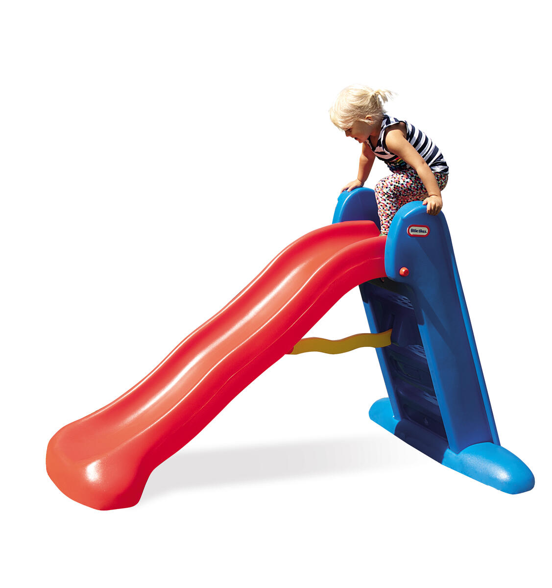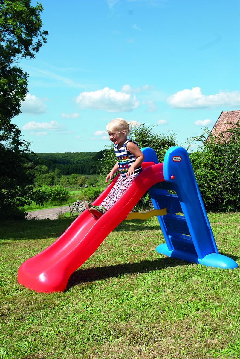 Hopfällbar. 152 cm lång glidbana med höga sidor och rundade kanter. Breda trappor och plattform; designad för stabilitet. Mått: 170x97x99 cm. Polyetylenplast. PVC-fri. Från 2-6 år.