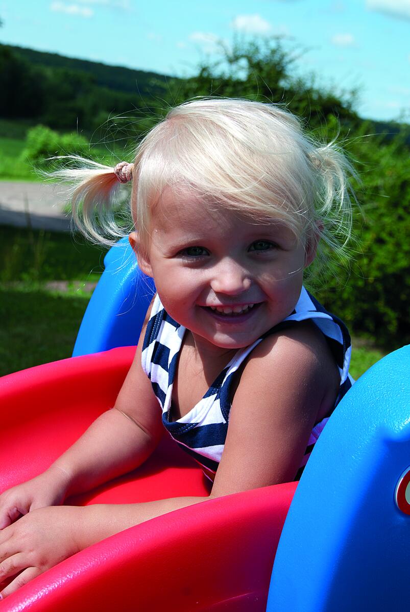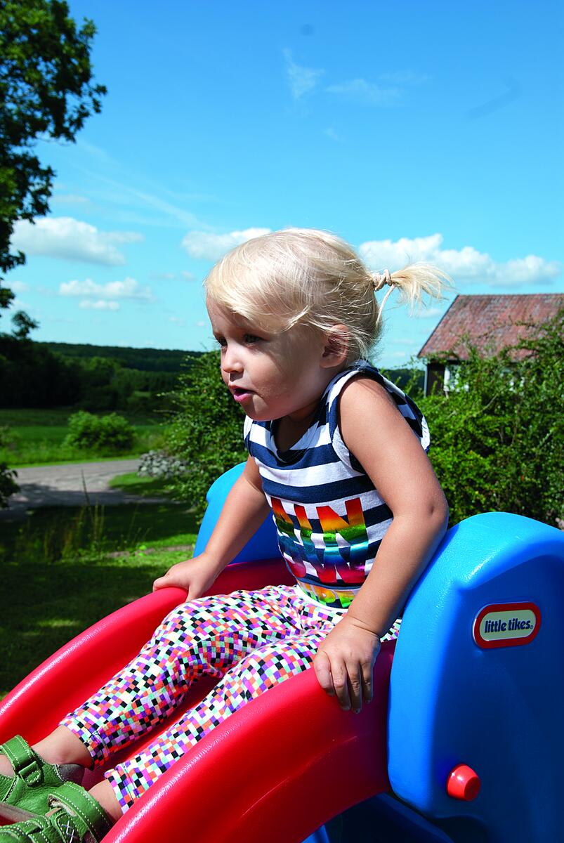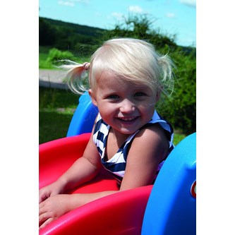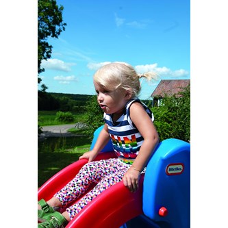 En hopfällbar rutschbana för de yngre barnen med höga sidor och rundade kanter. Monteras av vuxen, inga verktyg krävs. Mått: 99x46x59 cm. Polyetylenplast. PVC-fri. Från 18 mmånader.