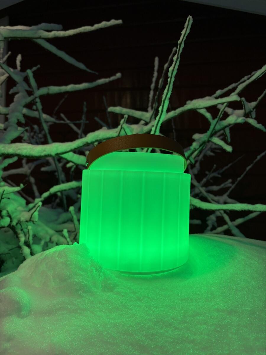 En fin detalj i t.ex. sinnesrummet. Välj mellan 12 färger eller låt den mjukt skifta mellan de olika. Laddas med en adapter och klarar sig ca 6 timmar.