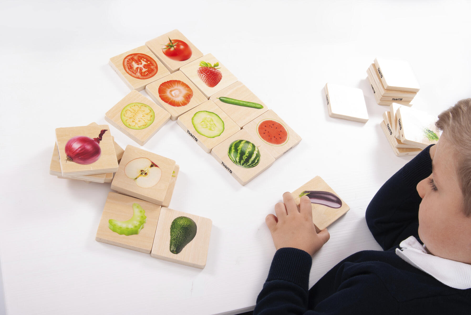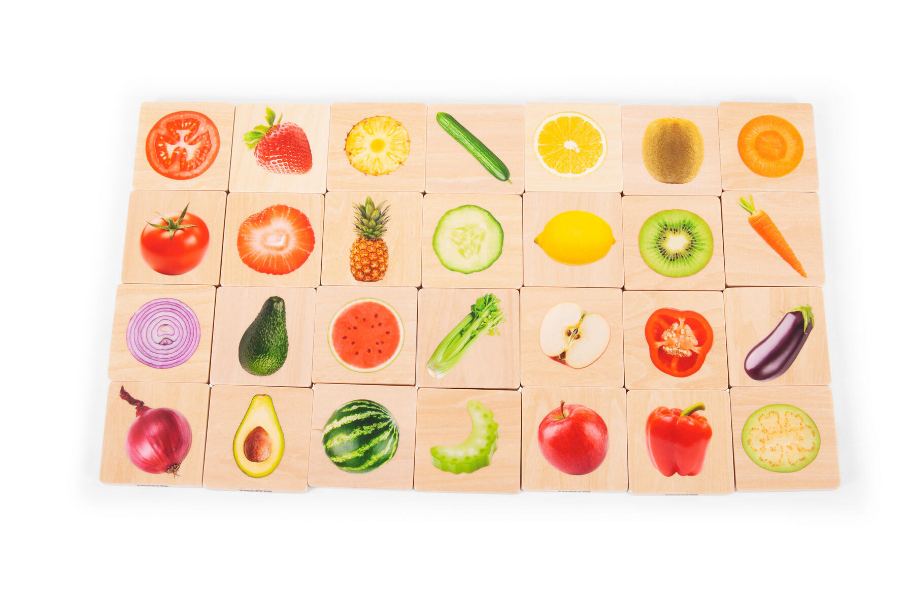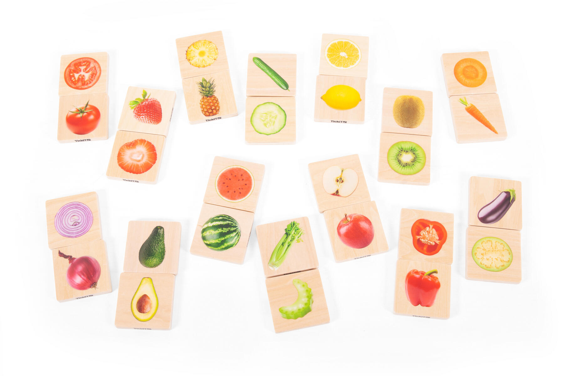Bilda 14 par bland frukt och grönsaker och matcha med hur den ser ut inuti. Fina fotografiska bilder. Rejäla bitar av bokträ. Av FSC-märkt trä. PVC-fri. Från 1 år.