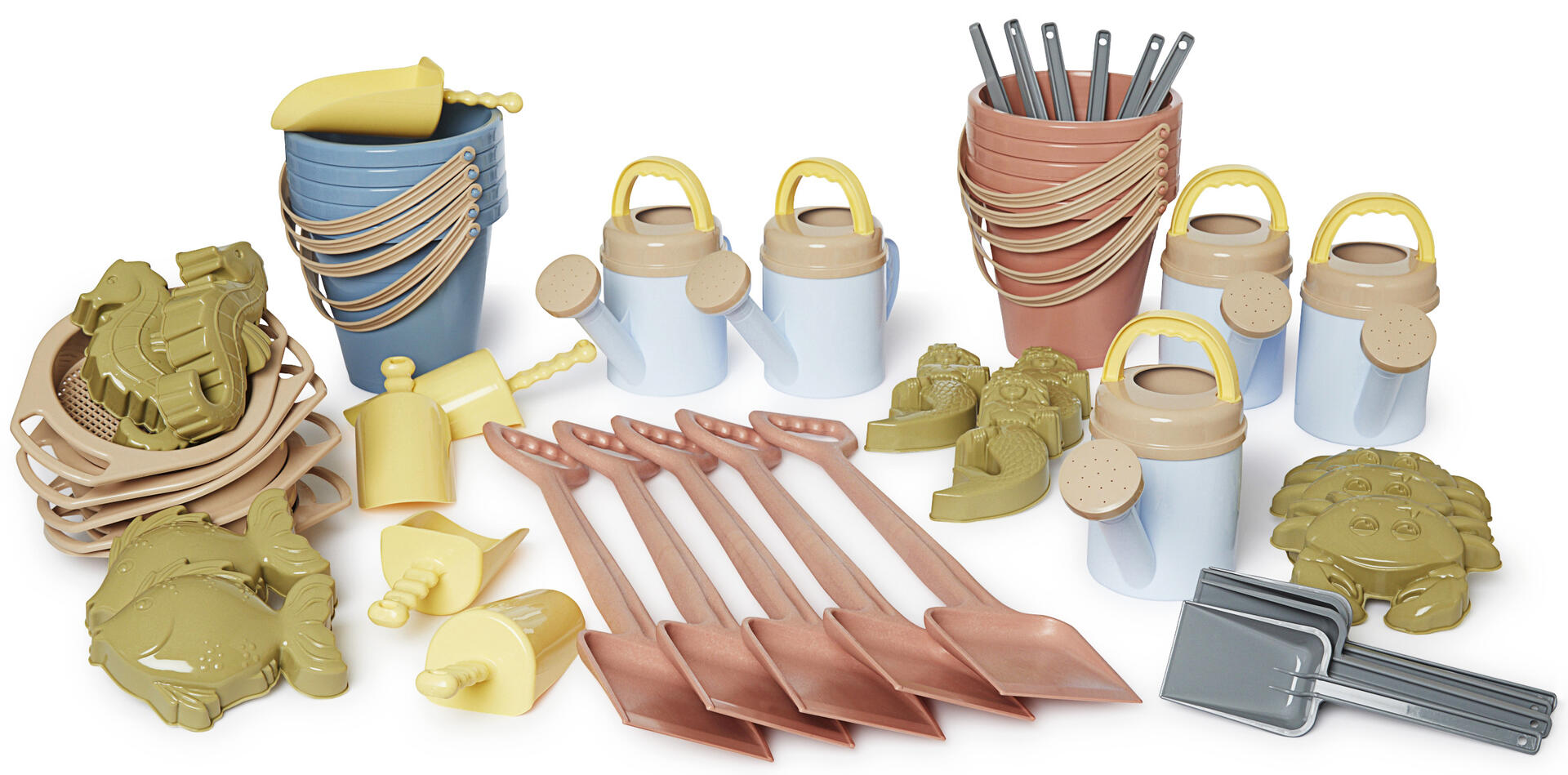 Innehåller hinkar, spadar, sandsåll, krattor, vattenkannor, sandhjul, byggbägare, sand- och vattenskopor samt sandformar i olika storlekar. Tål minusgrader. Av PP. Svanenmärkt, licensnummer 50950001. PVC-fri. Från 2 år.