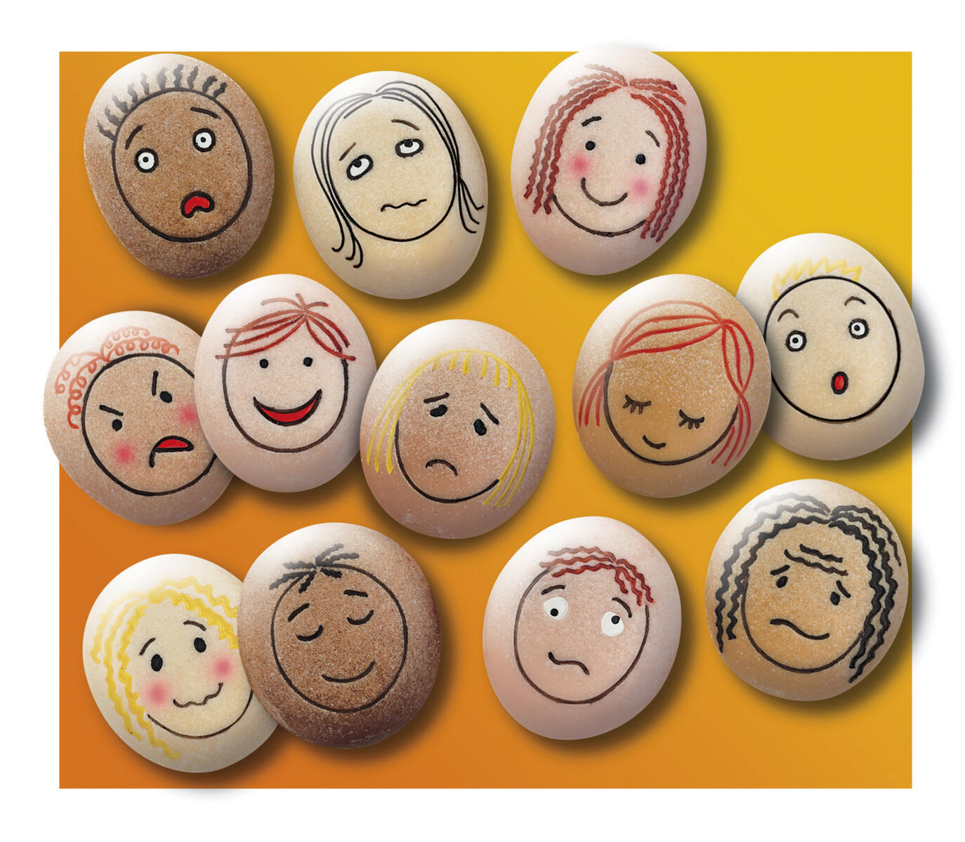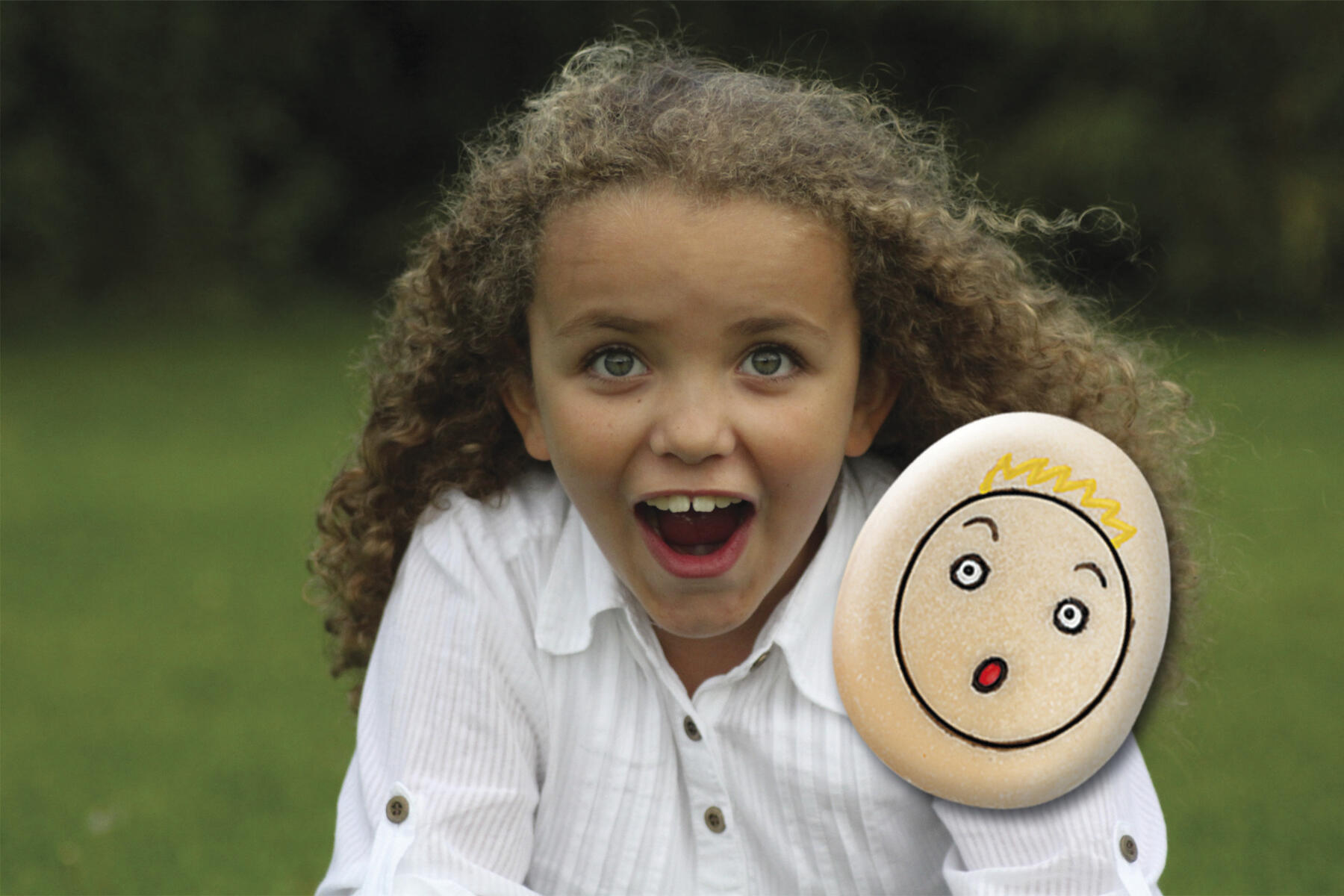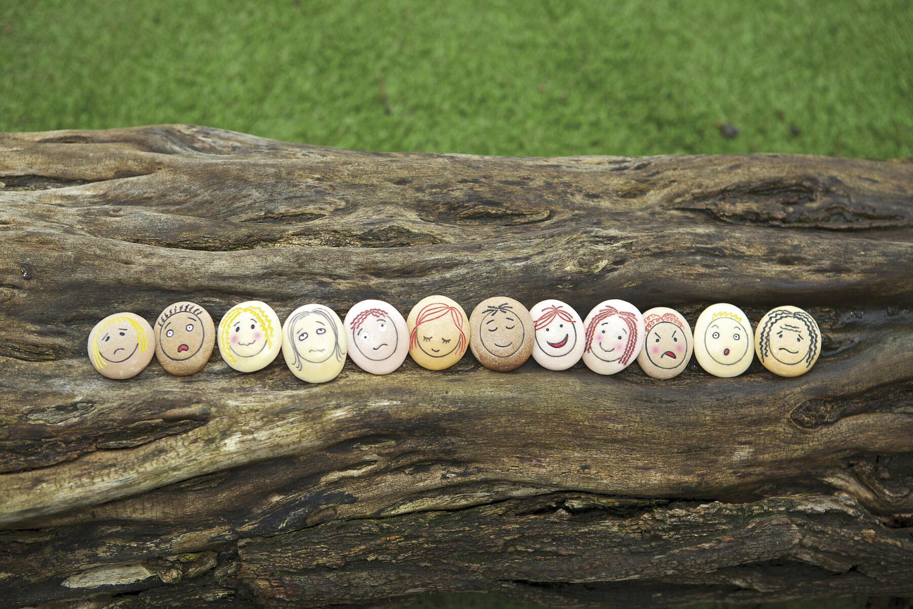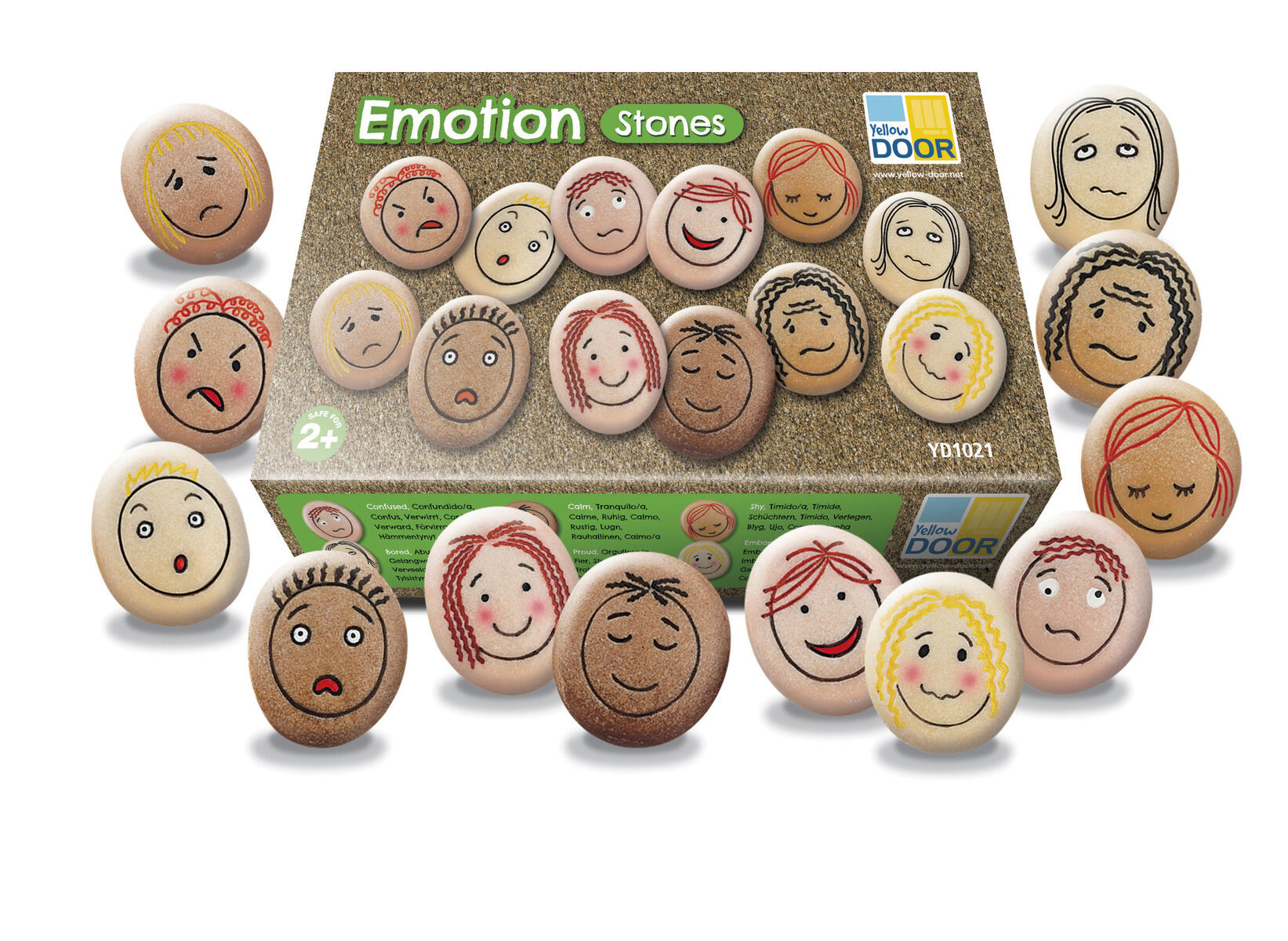 12 stenar som visar ansikten med olika känslouttryck. Genom att lära sig känna igen olika ansiktsuttryck och förstå de olika känslorna får barnen möjlighet att uttrycka sina egna känslor och känna empati med andra. Känslorna som visas är glad, ledsen, arg, rädd, orolig, förvånad, förvirrad, uttråkad, lugn, stolt, blyg och generad.
