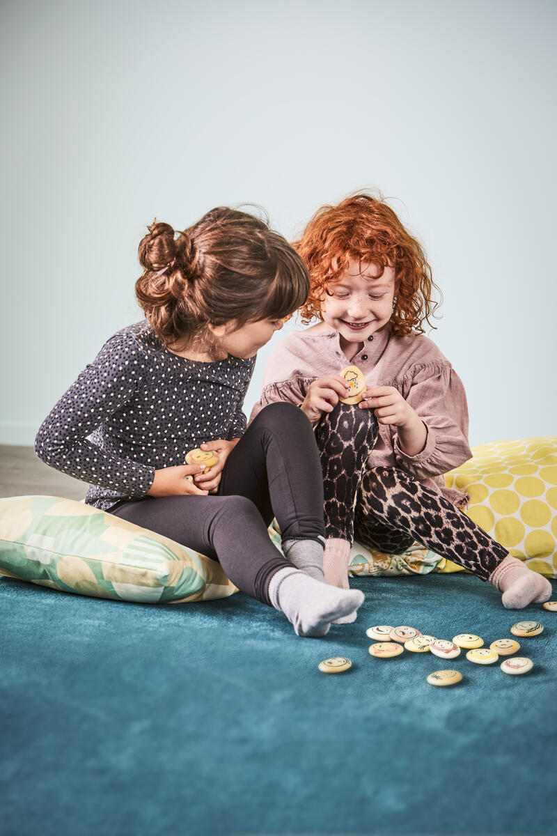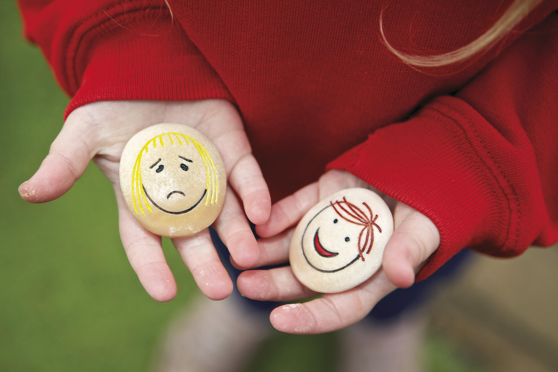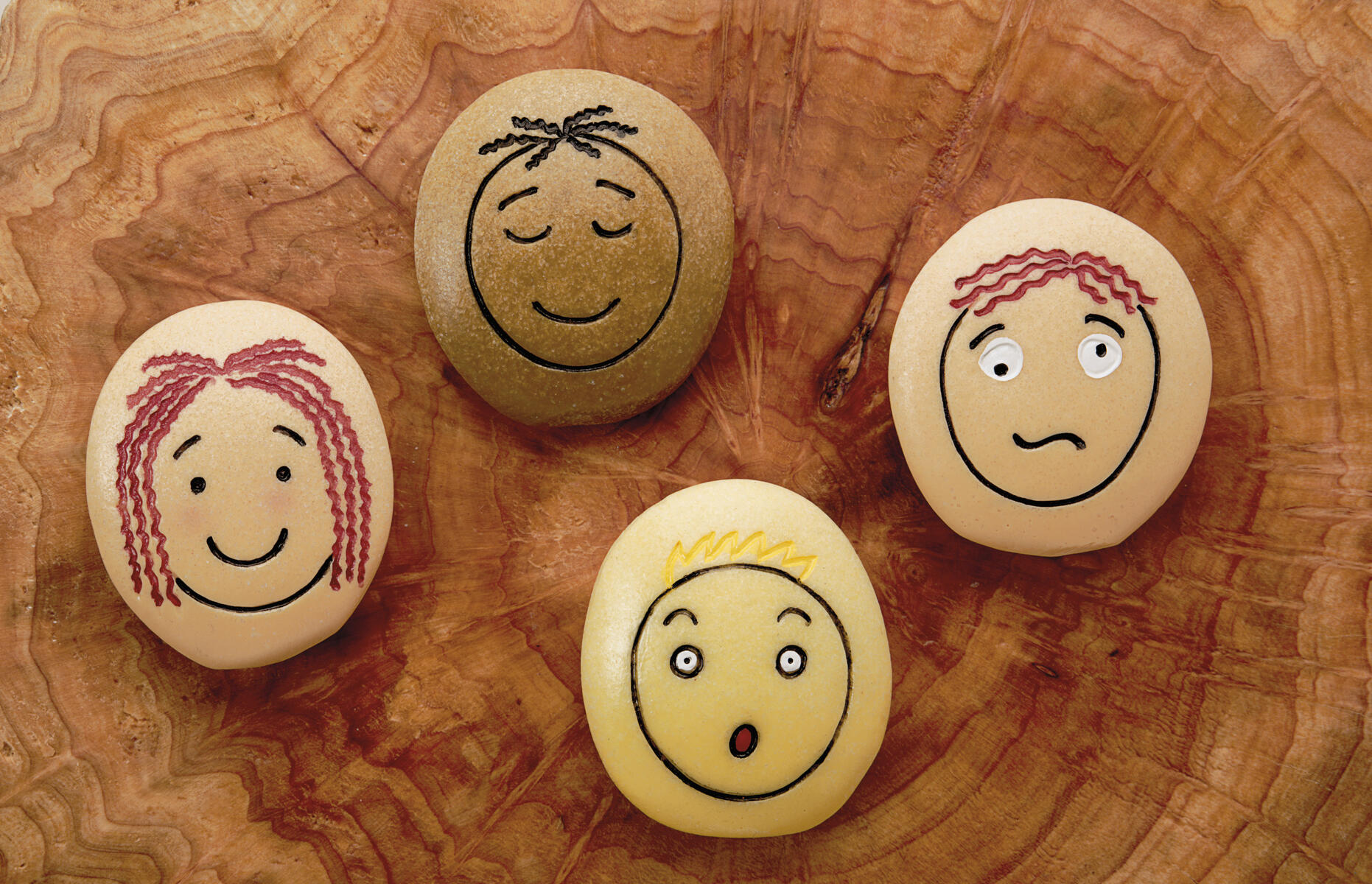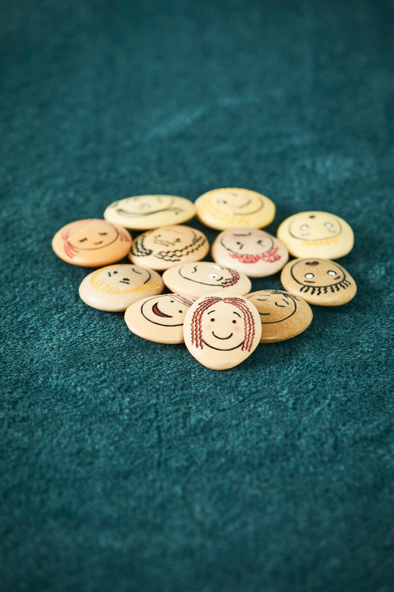12 stenar som visar ansikten med olika känslouttryck. Genom att lära sig känna igen olika ansiktsuttryck och förstå de olika känslorna får barnen möjlighet att uttrycka sina egna känslor och känna empati med andra. Känslorna som visas är glad, ledsen, arg, rädd, orolig, förvånad, förvirrad, uttråkad, lugn, stolt, blyg och generad.