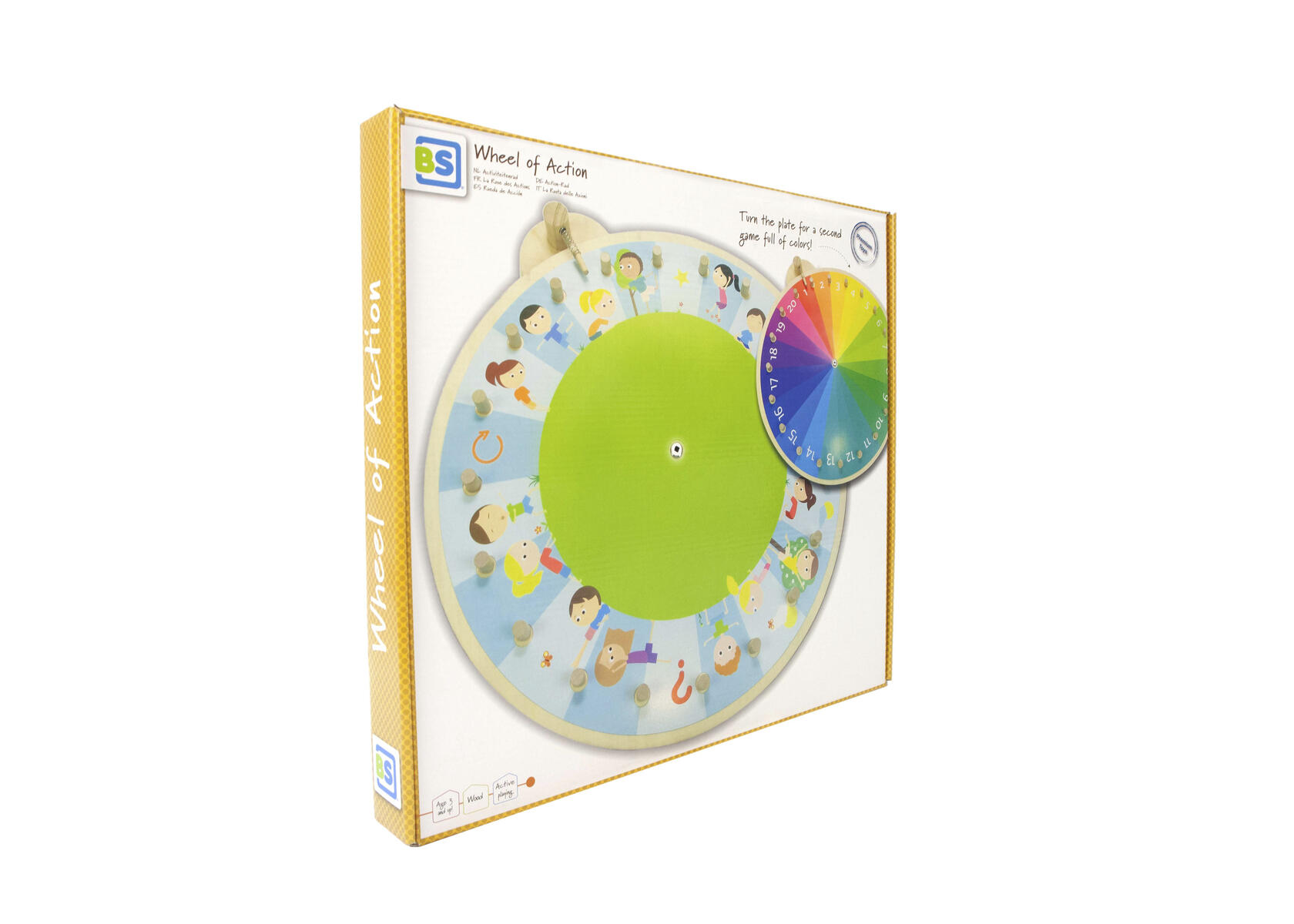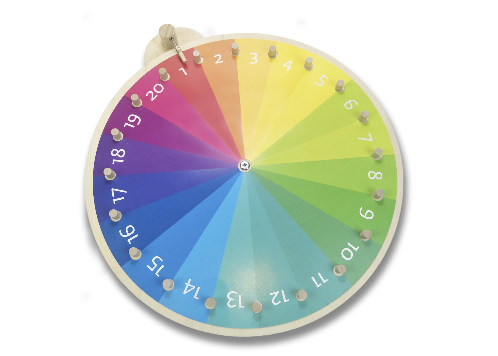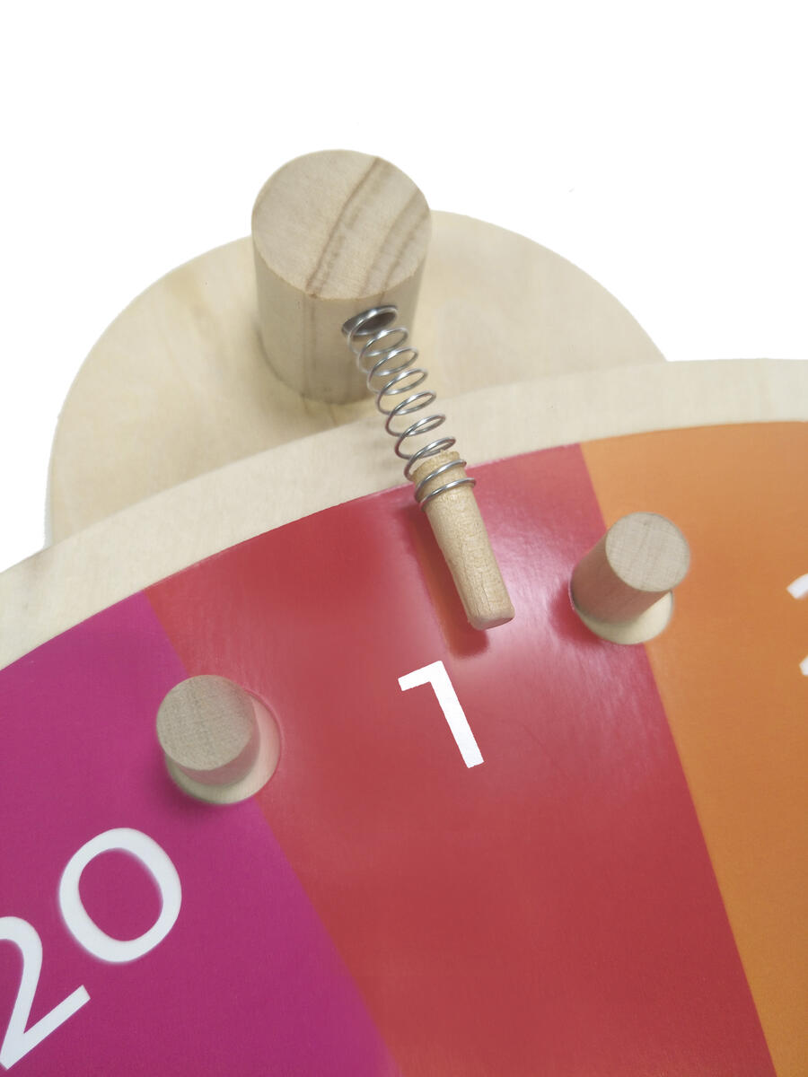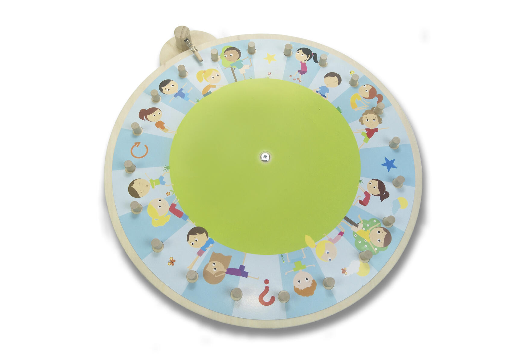 Lyckohjul som snurrar fram vilken rörelse som ska utföras. Vissa kräver balans medan andra bara är roliga eller lite utmanande. Vänd på hjulet och använd färger till egna idéer. Mått: 44x40x4 cm. Av plywood. PVC-fri. Från 3 år.