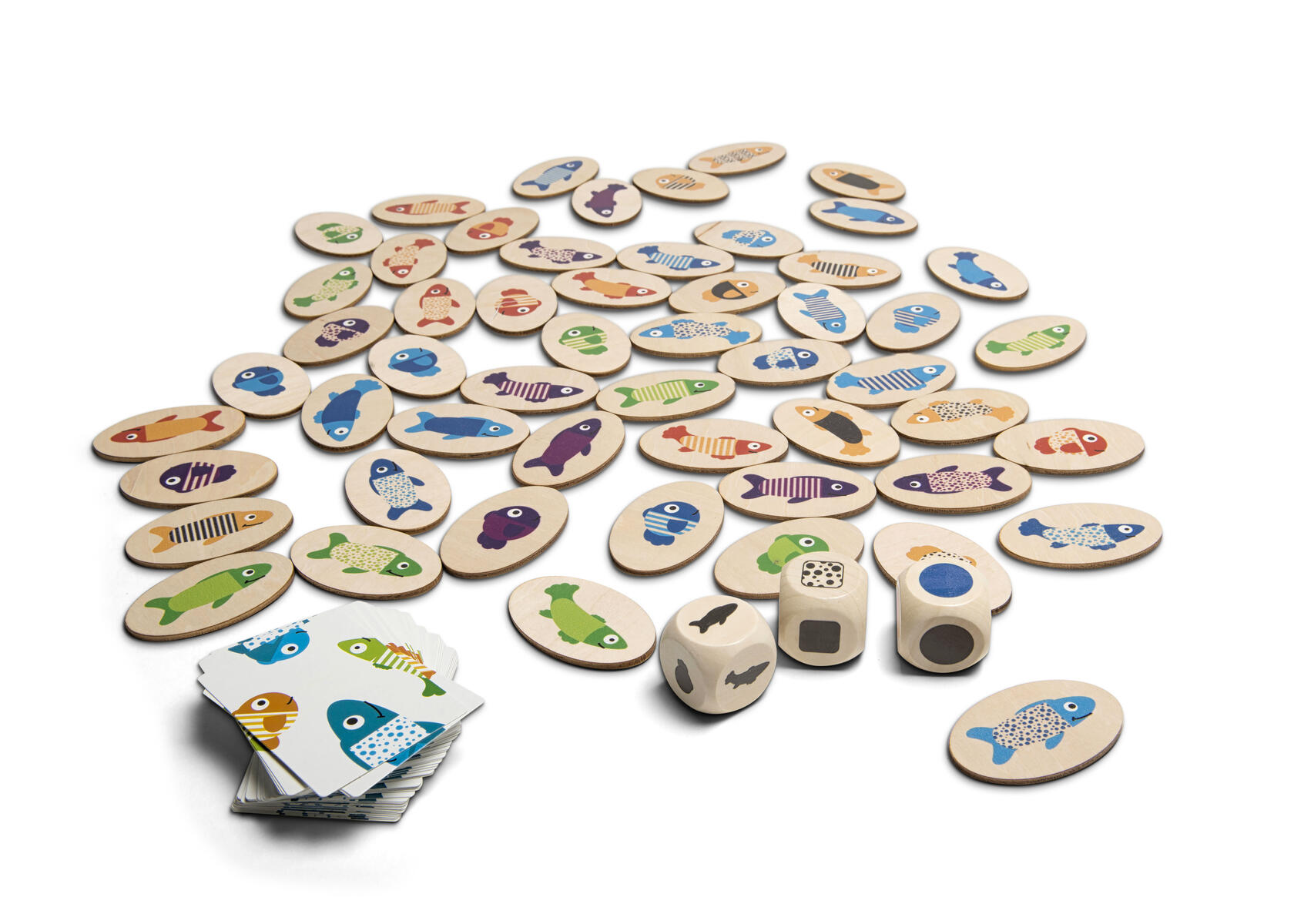 Hitta fisken genom att slå de tre tärningarna. Vem blir den första att hitta fisken i rätt form, färg och mönster som är avbildad på kortet? Om spelet är för svårt, spela genom att bara använda korten eller tärningarna. Av FSC-märkt trä och kartong. PVC-fri. Från 4 år.