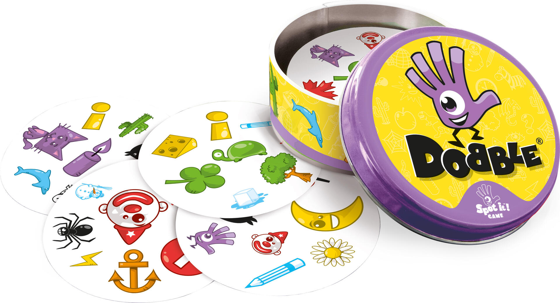 Spelet består av 55 kort med 8 symboler på varje kort och samma symbol visas på 2 kort. Det gäller att hitta de 2 lika symbolerna före dina motståndare. Ett roligt, snabbt och enkelt spel som tränar urskiljningsförmåga och reaktionssnabbhet. För 2-8 personer. Låda av metall, kort av kartong. Speltid ca 15 min. PVC-fri. Från ca 6 år.