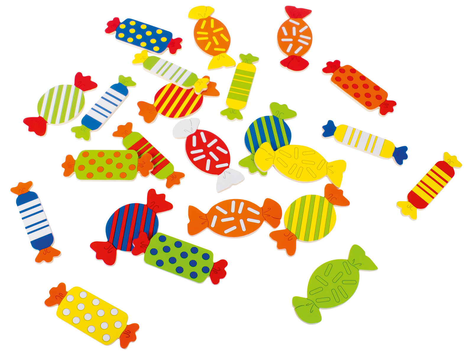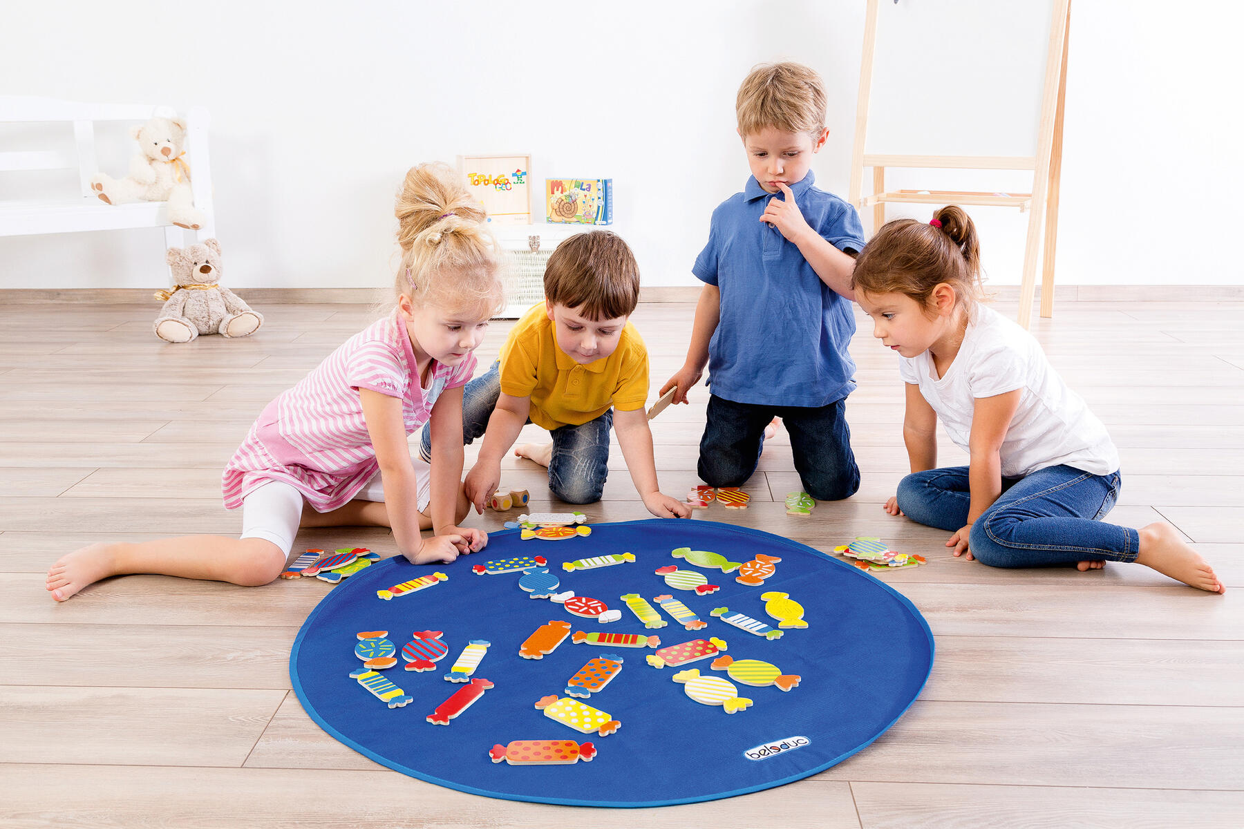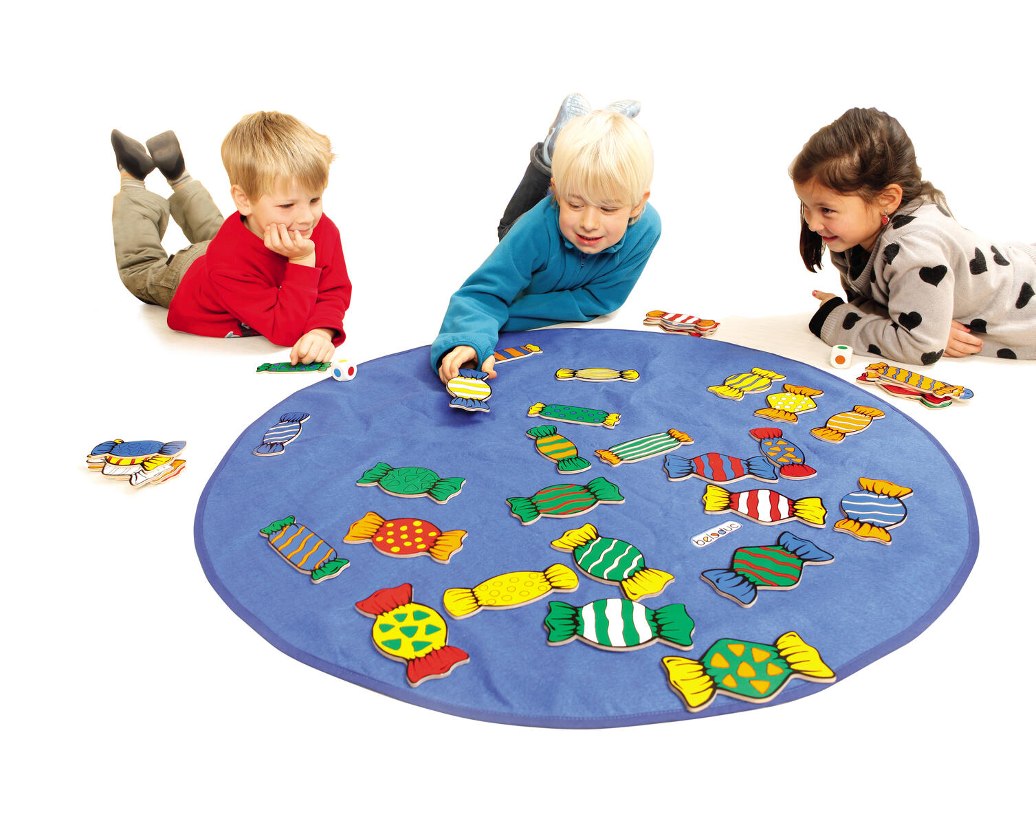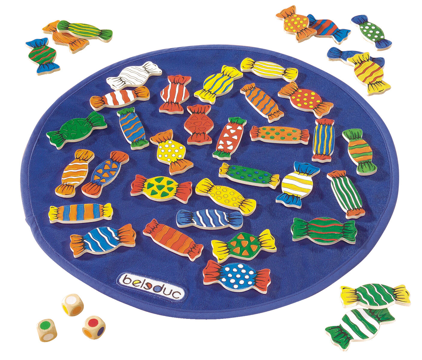 Ett stort och roligt golvspel i trä med 41 karameller som ligger blandade på mattan. Tre tärningar kastas och sedan gäller det att hitta den karamell som har samma färger som de tre tärningarna visar. Tränar färger och koncentration. Det finns tre olika spelsätt, instruktioner medföljer. Mått: mattan ø 130 cm, karameller 7x13 cm. PVC-fri. Från 4 år.