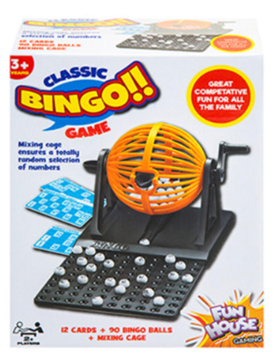 Snurra på bingokorgen, läs upp numret och vänta på att någon ropar ”Bingo!”. Innehåller bingosnurra av metall, nummerkulor 1-75, markörer och 18 bingobrickor. Speltid ca 30 minuter. PVC-fri. Rekommenderas från 6 år.