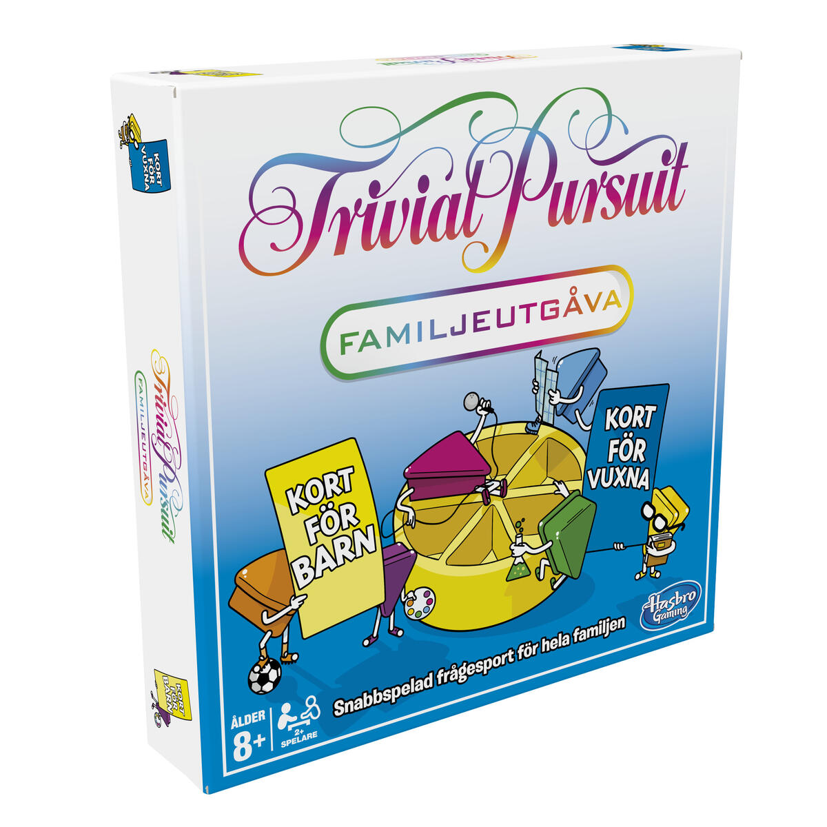 I familjeutgåvan av Trivial Pursuit finns ämnen och utmaningar för alla så att barnen kan vinna över de vuxna. Innehåller 2 400 frågor, där hälften är riktade speciellt till barnen. Spela individuellt eller i lag. När du svarar rätt på frågorna vinner du tårtbitar. För 2-6 spelare. Från ca 8 år.
