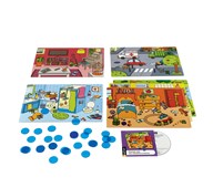 6 bildkort, 30 marker och en CD. Utforska omgivningen genom att lyssna på ljud och identifiera dem på bilderna. Det finns 30 ljud som är vanliga i barnens vardag: köket, vardagsrummet, sovrummet, badrummet, på gatan och i parken. PVC-fri. Från 2 år.
