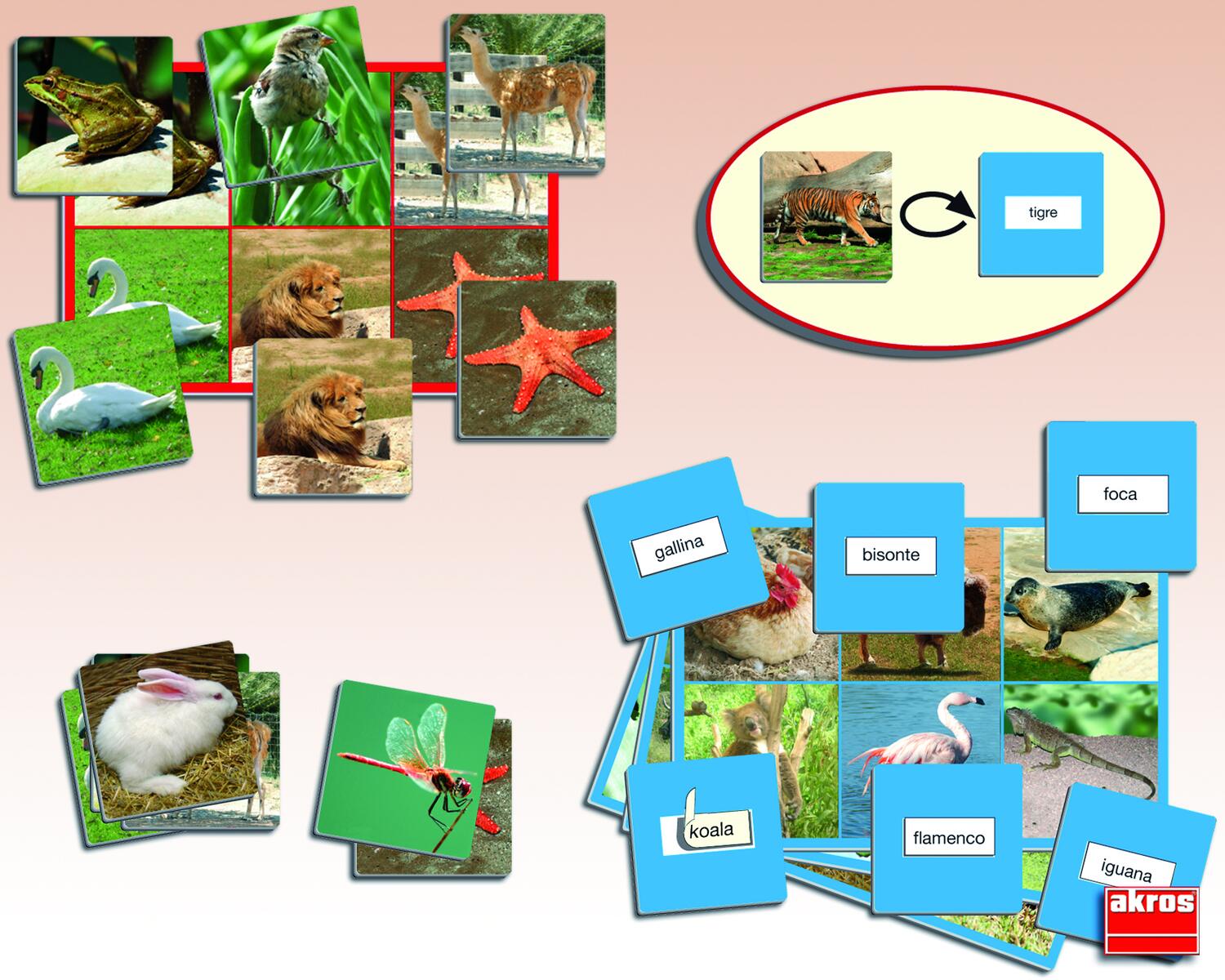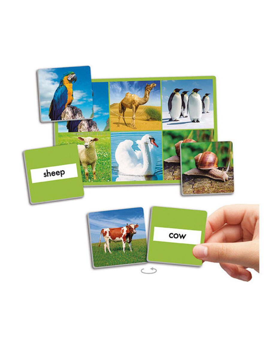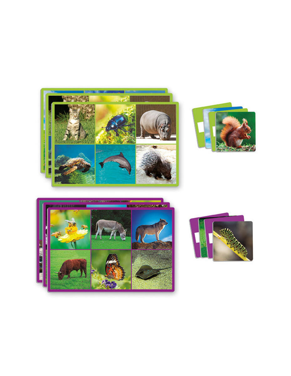 Detta stora lotto med djurfotografier kan spelas på 2 olika sätt. Bilden på lottobrickan matchas antingen mot bilden på kortet eller mot rätt ord på baksidan av kortet. Innehåller 12 lottobrickor och 72 bildkort, samt stickers med djurets namn vilka klistras på baksidan av kortet. Upp till 12 barn kan spela samtidigt. Mått på bricka: 18x12 cm, mått på kort: 5,5x5,5 cm. Av kraftig kartong. PVC-fri. Från 3 år.