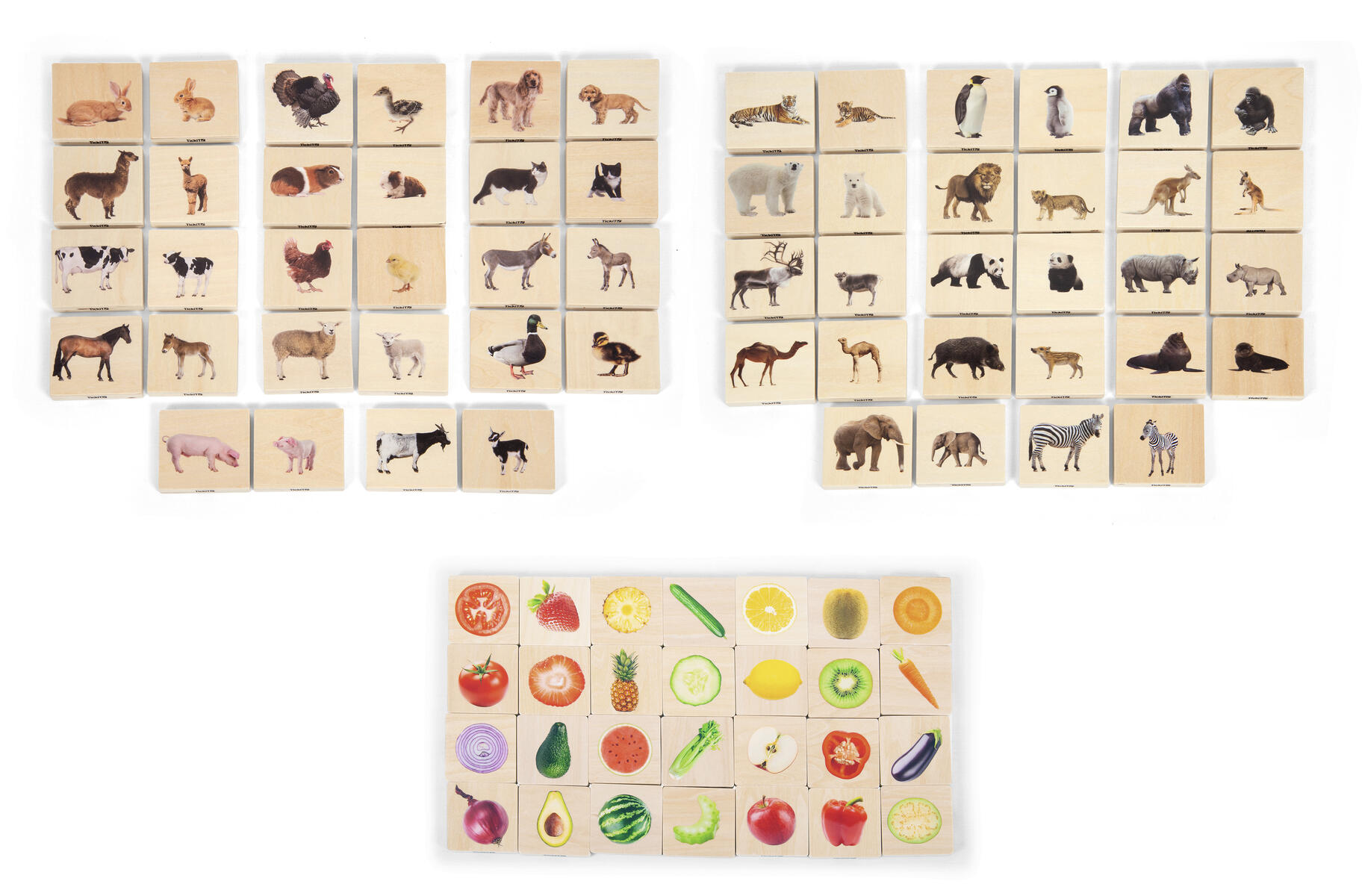 20 memobrickor som förvaras i en tygpåse. Ena brickan visar ett djur och dess matchande bricka visar en närbild på djurets hud. Matcha t.ex. dalmatinern med sina fläckar, sköldpaddan med skalet eller zebran med sina ränder. Motiven är tryckta med giftfri värmeöverföringsteknologi och förseglade med en klar lack. Av FSC-märkt trä. Mått: ø 5 cm. PVC-fri. Från 2 år.