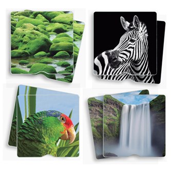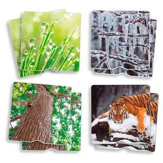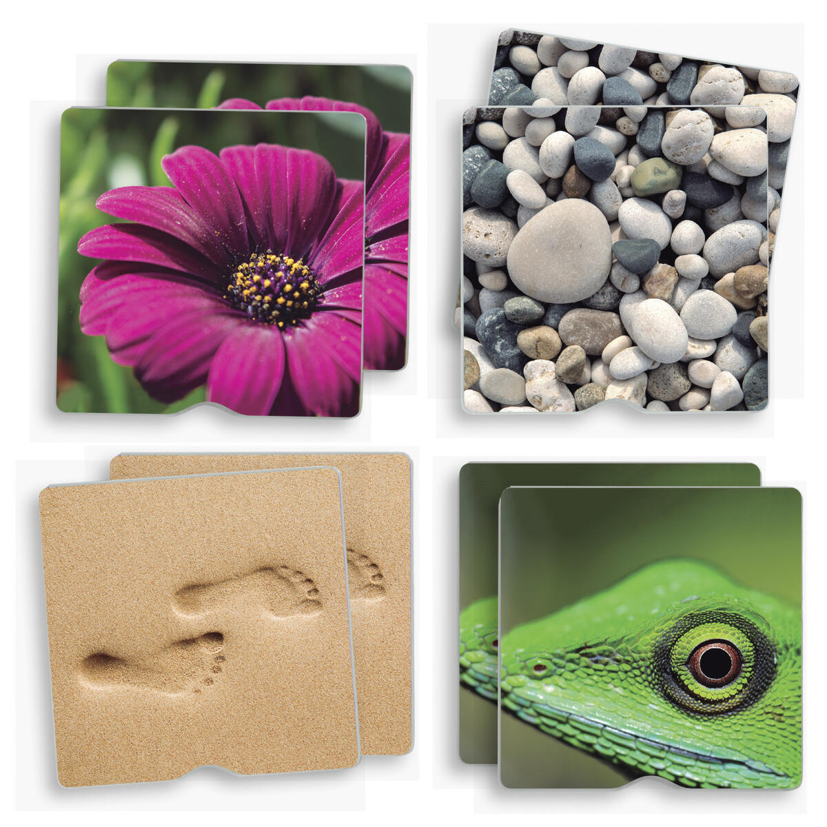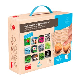 Ett taktilt memo med olika textur på fotografier med naturmotiv. Kan spelas som ett klassiskt memory där man utforskar de taktila ytorna, eller genom att med ögonbindel försöka matcha paren. Innehåller 34 kort av kraftig kartong i storlek 9x9 cm. PVC-fri. Från 3 år.