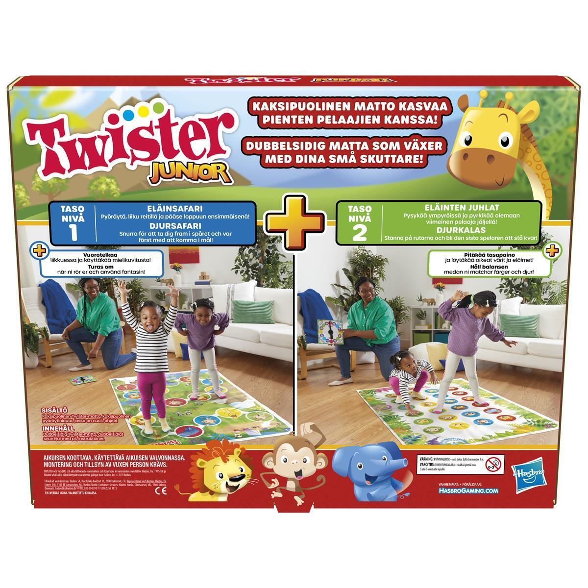 Juniorvariant av det klassiska spelet Twister. Spelet inkluderar en tvåsidig lekmatta och en vändbar snurra för två olika spelnivåer. På nivå 1 snurrar barnen på snurran för att upptäcka safarin. Barnen turas om att upptäcka färger och härma djurens läten och rörelser. Vänd på lekmattan för att spela nivå 2. Snurra på snurran för att se vilken färg och vilket djur spelarna ska sätta foten eller handen på. Den spelare som är sist kvar vinner. Från 3 år.