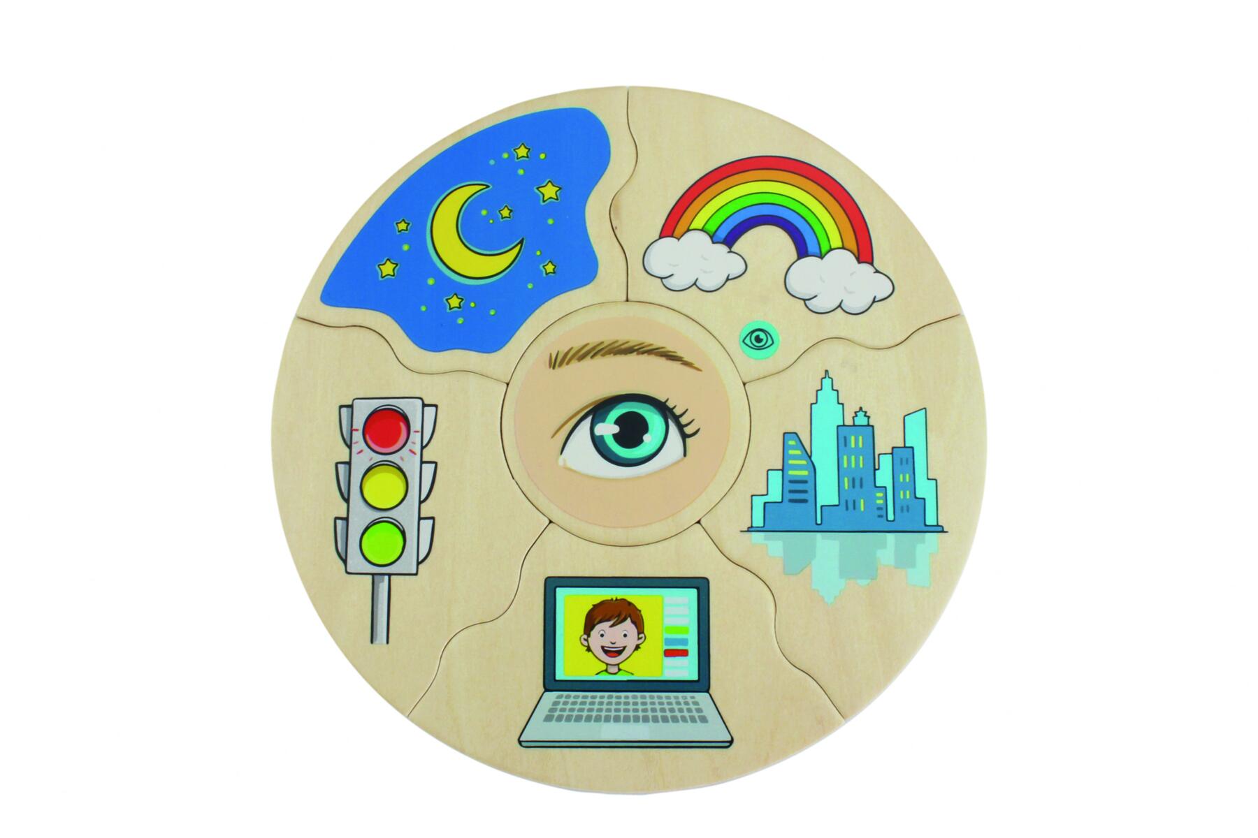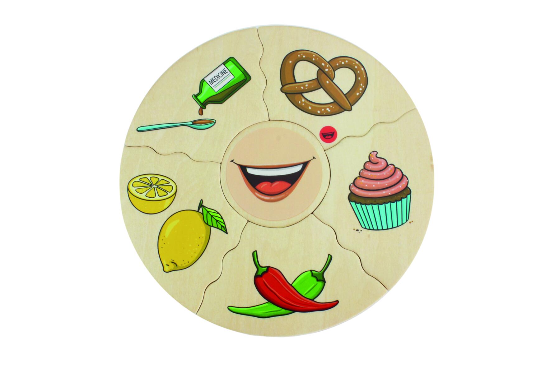 Ett roligt spel där man väljer en mittdel, vänder alla andra upp och ner och blandar dem. Turas om att vända upp brickorna för att se vem som får sin tårta klar först. I den här versionen utforskas våra olika sinnen. Av FSC mix. Mått: 16 cm. Från 3 år.