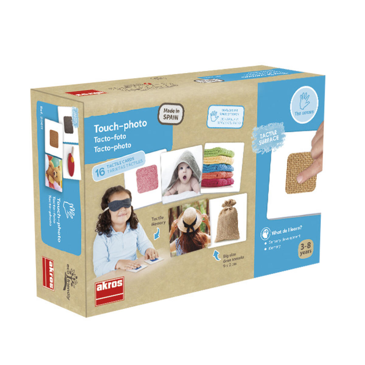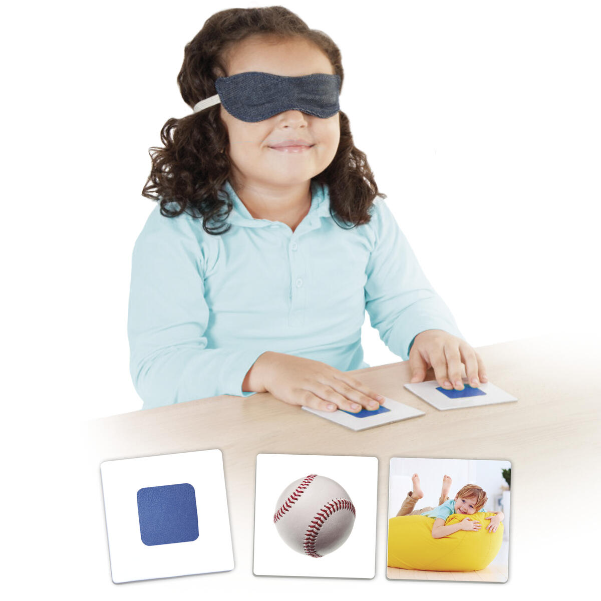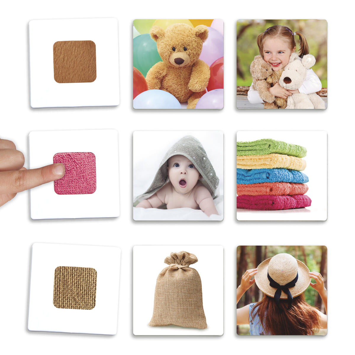 En sensoriskt spel för att utveckla sinnet för känsel genom att känna igen 8 olika texturer och matcha dem med foton. Innehåller 16 kort med taktil yta (9x9 cm), 16 kort med bilder (9x9 cm) och två ögonbindlar. PVC-fri. Från 3 år.